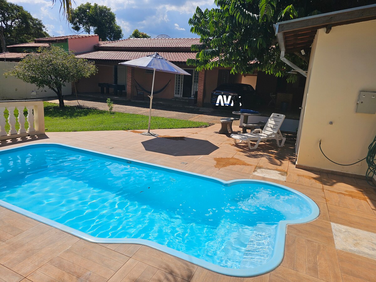 Bahay sa harap ng dam na may balkonahe, barbecue, sala, kusina at 4 na suite. Ang sakahan ay may kabuuang lugar na 6,000 m² na may bukas na paradahan, bilang karagdagan sa halamanan at napaka - berde. Sa malapit ay may mga hotel, restawran, panaderya, mini - marker, marina at iba pang pasilidad. Ang kusina ay mahusay na nilagyan, na may kalan, microwave oven, duplex refrigerator, pinggan, kaldero at plato. Magugustuhan mo ito. Mainam ang patuluyan ko para sa mga mag - asawa, pamilya (na may mga anak), at alagang hayop.