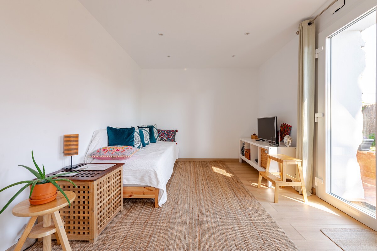 Ang apartment ay 45 m2 Sa pangunahing palapag, may loft na may sala at kainan at munting kusina, at nasa likod ang banyo. Sa itaas, may kahoy na attic room na may double bed at access sa 15 m2 na terrace na may mesa at upuan kung saan ka puwedeng kumain o mag-meryenda. Ang pasukan, apartment at terrace ay hiwalay. Kahit na sarili mong pag‑iisip ang pag‑in, handa kaming tumulong sa anumang kailangan mo. Isang alagang hayop lang ang pinapayagan. Kung mas marami pa, tanungin muna ako!!
