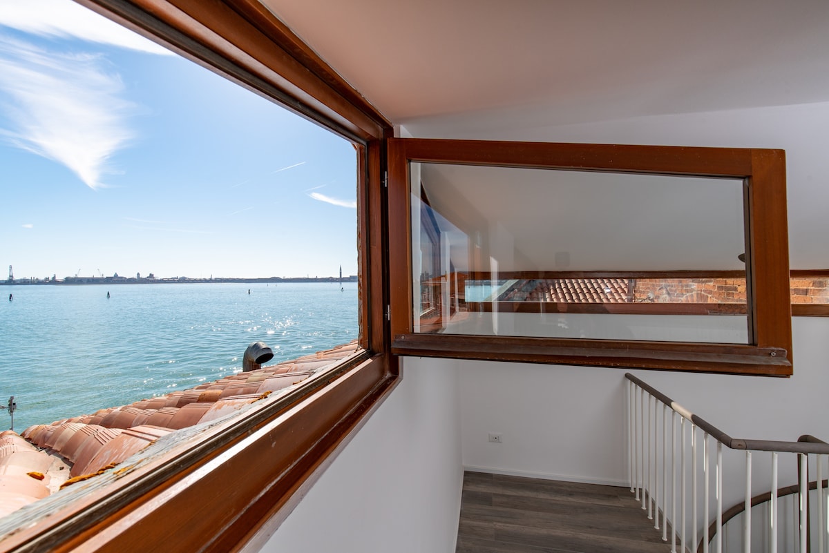Modernong appartament sa tabi ng parola ng Murano. Matatagpuan na may nakamamanghang tanawin sa harap mismo ng lagoon. Mula sa malalawak na bintana, puwede mong hangaan ang silhouette ng S.Mark tower at marami pang ibang simbahan sa Venice. Puwede kang kumain sa sala, kung saan matatanaw ang lagoon. Madaling mapupuntahan mula sa Venice Airport at Station sa pamamagitan ng serbisyo ng pubblic ng bangka Sa tabi ng pangunahing water pubblic stop kung saan umaalis ang mga linya papunta sa: Burano, Venice, at Lido beach mula Hunyo. Available na room service mula sa malapit na Pizzeria