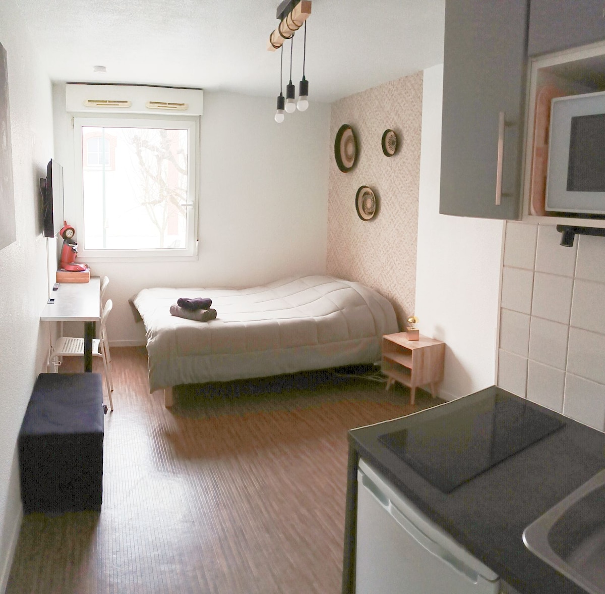 Studio 20 m2 10 minuto sa downtown Reims 12 minuto mula sa istasyon ng tren nang naglalakad , at 50 m mula sa istasyon ng bus, malapit sa mga tindahan at Arena , may bayad na paradahan sa harap ng studio, at may bayad na lugar na may kapansanan sa loob ng gusali. Available ( humiling ng token sa reception) libreng wifi sa pamamagitan ng pagkonekta sa internet portal