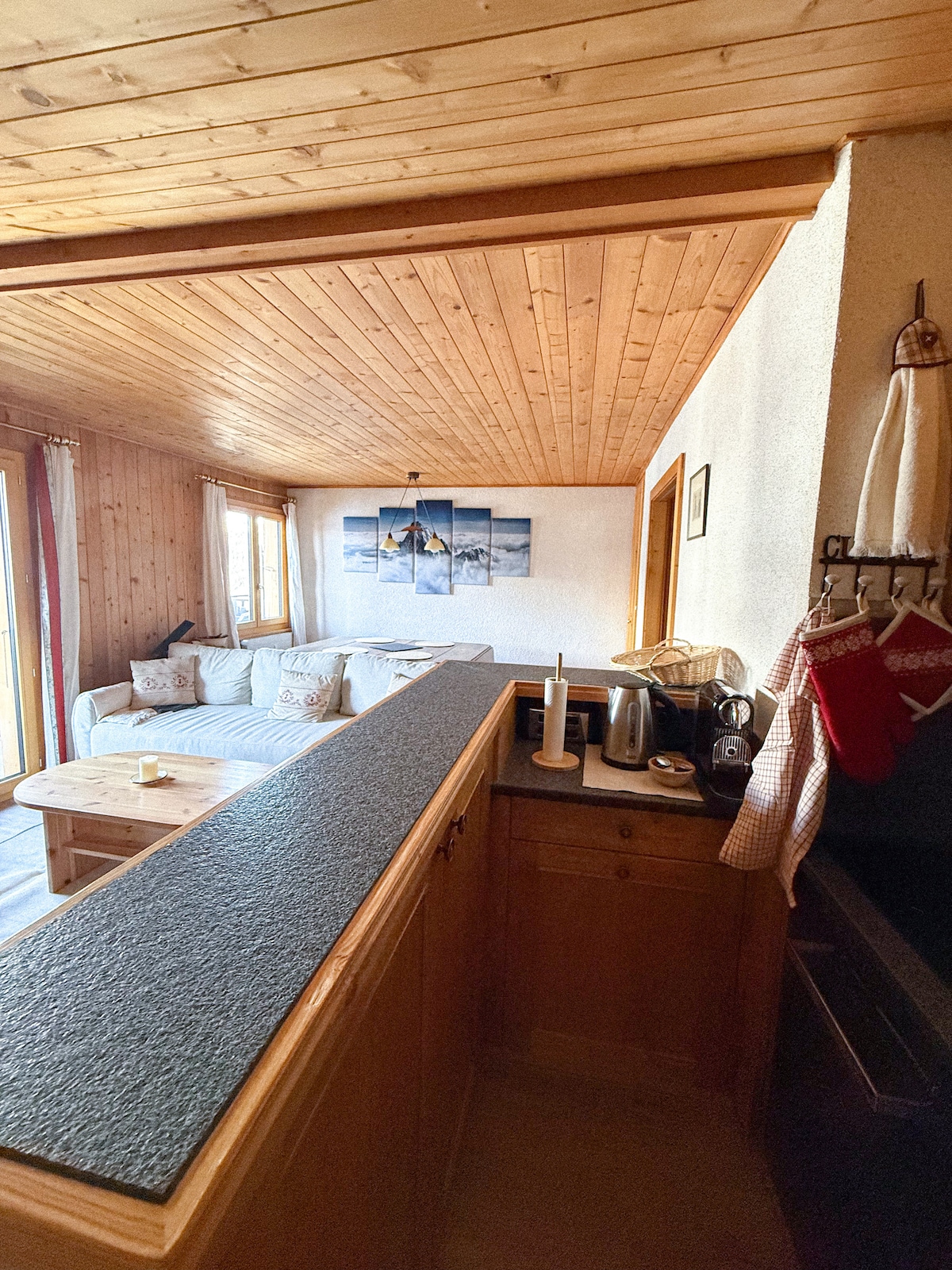 Ganap na kumpletong apartment sa paanan ng mga ski slope. Pribadong Paradahan. South Terrace. BBQ, dish washer, wash machine, Nespresso, Fondue set, baking gears, brand new kitchen, freezer, champagne at wine glasses. Buksan ang apoy. 2 silid - tulugan (1 master queen size bed, 3 single bed). Paghiwalayin ang wc. Nilagyan ang banyo ng komportableng paliguan. High speed Fiber internet para manood ng hanggang 4 na magkakaibang pelikula sa Netflix nang sabay - sabay.