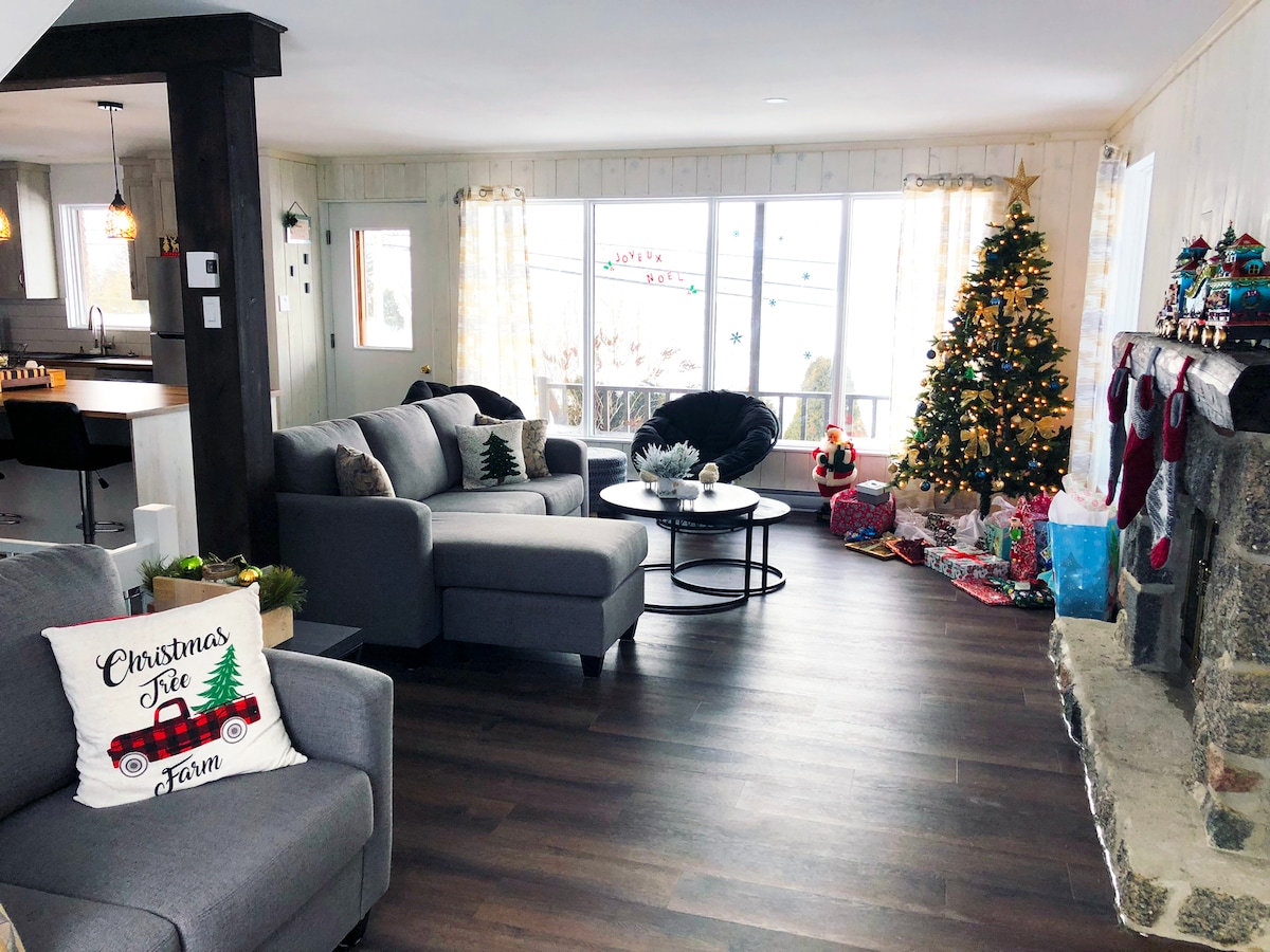 Matatagpuan sa pribadong daanan, magandang country house na may magagandang tanawin ng St. Lawrence River. Katedral na bubong na may double - sided na fireplace. Ang malaking 28 - foot canopy pati na rin ang 2 silid - tulugan ay nakaharap sa paglubog ng araw. Mga high - end na kasangkapan. May kahoy at pribadong 140,000 talampakang kuwadrado na may access sa isang maliit na lawa. Natural skating rink sa taglamig. Outdoor terrace na may BBQ. Fire pit sa labas. Isang property na may natatanging karakter. Hindi paninigarilyo, walang alagang hayop 3 season canopy