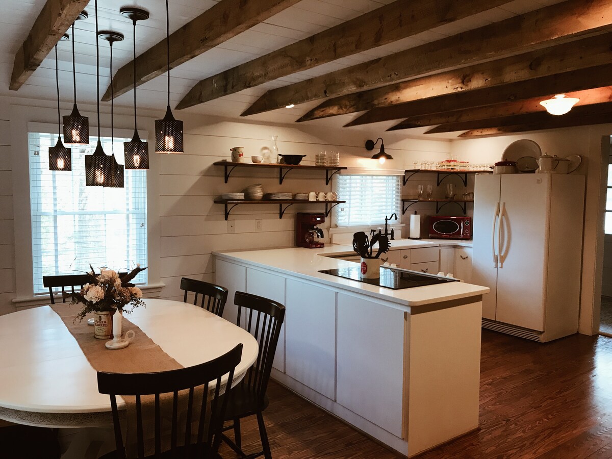 Built in 1932 as a log cabin, this completely renovated farm house is set in a peaceful rural setting. This cozy cottage has all modern amenities but maintains its character and charm, with nostalgic nods to its tobacco farm roots. Set on a 35 acre farm, chickens will be your neighbors.