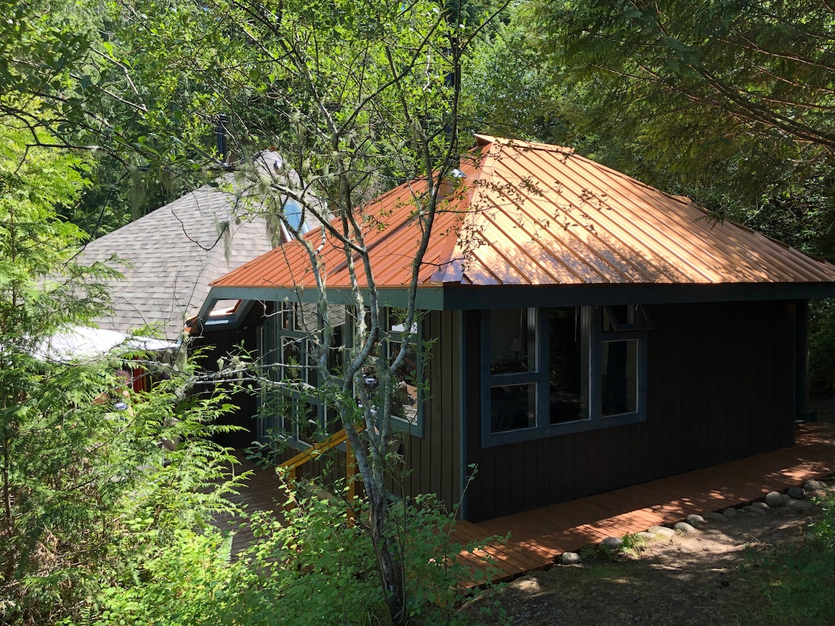 Tumakas sa bukas na konsepto na ito ng 2 silid - tulugan na cottage, na matatagpuan sa tahimik na kagubatan. Napapalibutan ng mababangong puno ng fir at sedro, pinag-isipang idisenyo ang tuluyang ito na may makintab na pinainit na sahig na kongkreto, matataas na kisame, at kalan na ginagamitan ng kahoy, na nagbibigay ng komportable at kaaya-ayang kapaligiran. Magrelaks sa tabi ng apoy o magbabad sa hot tub pagkatapos ng isang araw ng paglalakbay sa kagandahan ng Juan De Fuca Trail o mga kalapit na beach. Halika at maranasan ang lahat ng iniaalok ng Jordan River.