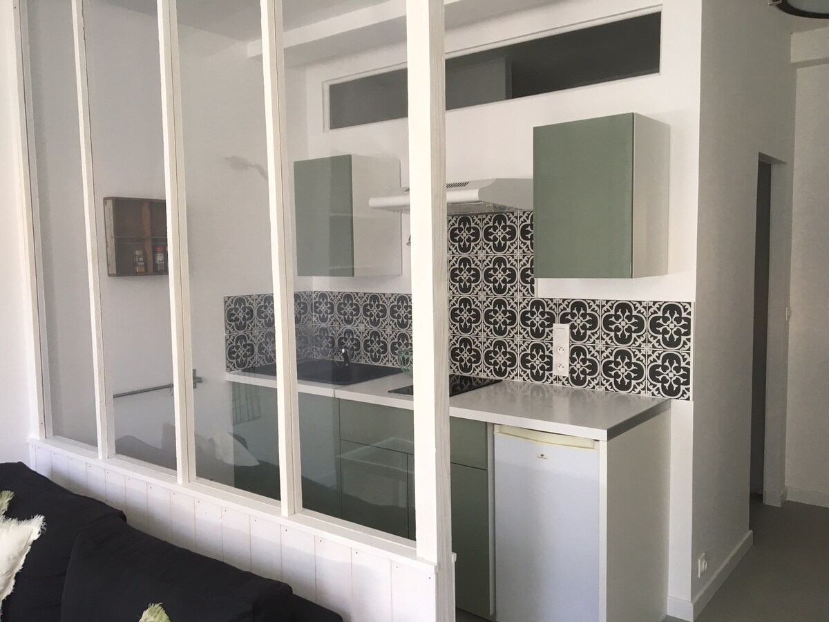 Holiday bahay ng 50 m² ganap na renovated. 2 kuwarto: Kusina equipped, living room - dining room, 1 bedroom na may palanggana at walk - in shower. 1 mezzanine. 1 kuwarto na may washing machine. 1 independiyenteng toilet. Nakapaloob sa labas at terrace (garden table at 2 sunbed, barbecue). May mga sapin at tuwalya.