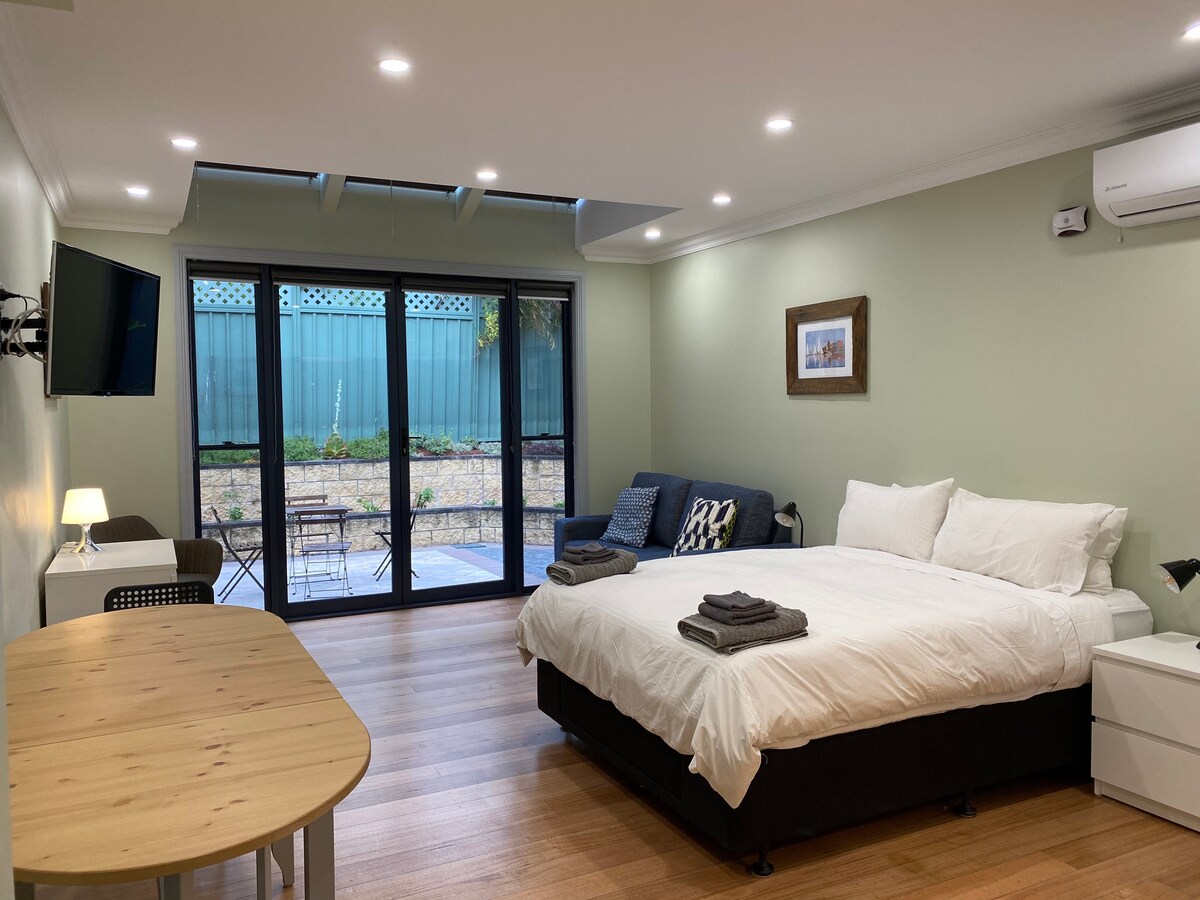 Tahimik at Pribadong Purpose - built studio. Sariling pasukan at Banyo. Mga modernong fitting na may king size bed at de - kuryenteng kumot sa taglamig. Mga mararangyang linen at toiletry. Smart TV, Kitchenette na may bench na gawa sa bato. Aircon, Microwave, toaster, tsaa /kape (instant at Nespresso)May light breakfast. BBQ at pribadong beranda. Wardrobe. Bagong washing machine. Gumising sa tunog ng mga ibon. LGBTI friendly. Secure gated parking. Kwalipikado ang mga business traveler/regular na bisita para sa programang may katapatan.