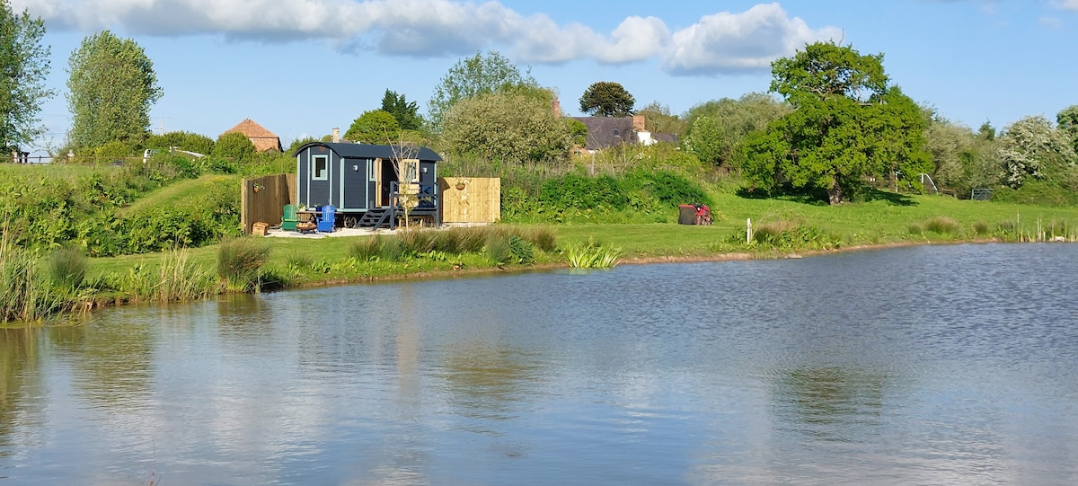 Shepherd 's Hut na may mga modernong twist: underfloor heating, banyo, nilagyan ng yunit ng kusina na may refrigerator at microwave. Puwedeng magbigay ng double bed na may magandang kalidad na mga duvet at unan pero puwedeng magbigay ng hypo allergenic na sapin sa higaan. May de - kuryenteng kumot sa kama at hair dryer. TV na may Chromecast/Netflix. Libreng WiFi. Maluwalhating tanawin sa kanluran patungo sa Welsh Hills sa tahimik na lugar sa kanayunan. Napapaligiran ng maliit na bakod na hardin ang kubo ng fire pit (kahoy na ÂŁ 10 kada sako) na BBQ at imbakan sa labas. Surcharge na ÂŁ 12 kada pagbisita na mainam para sa alagang aso.