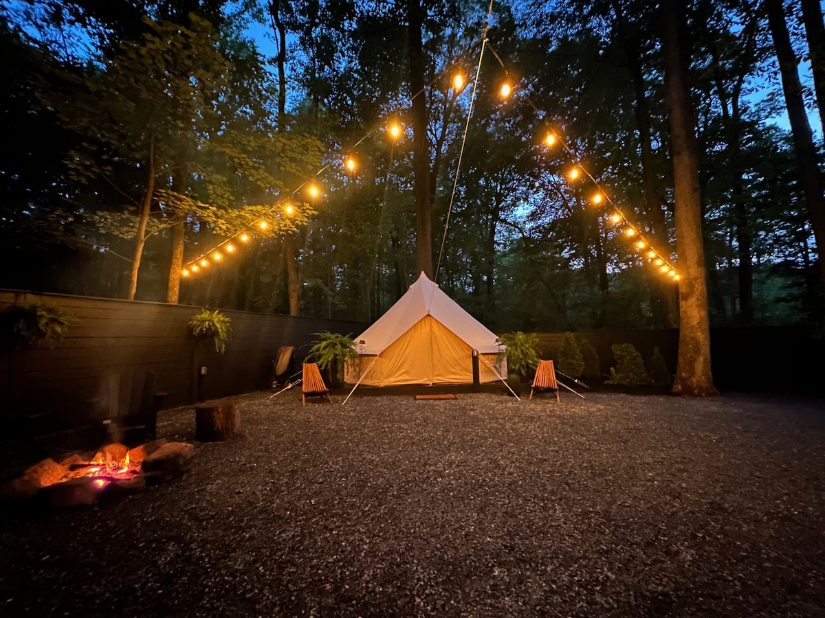 Marangyang glamping tent na matatagpuan sa mga puno.