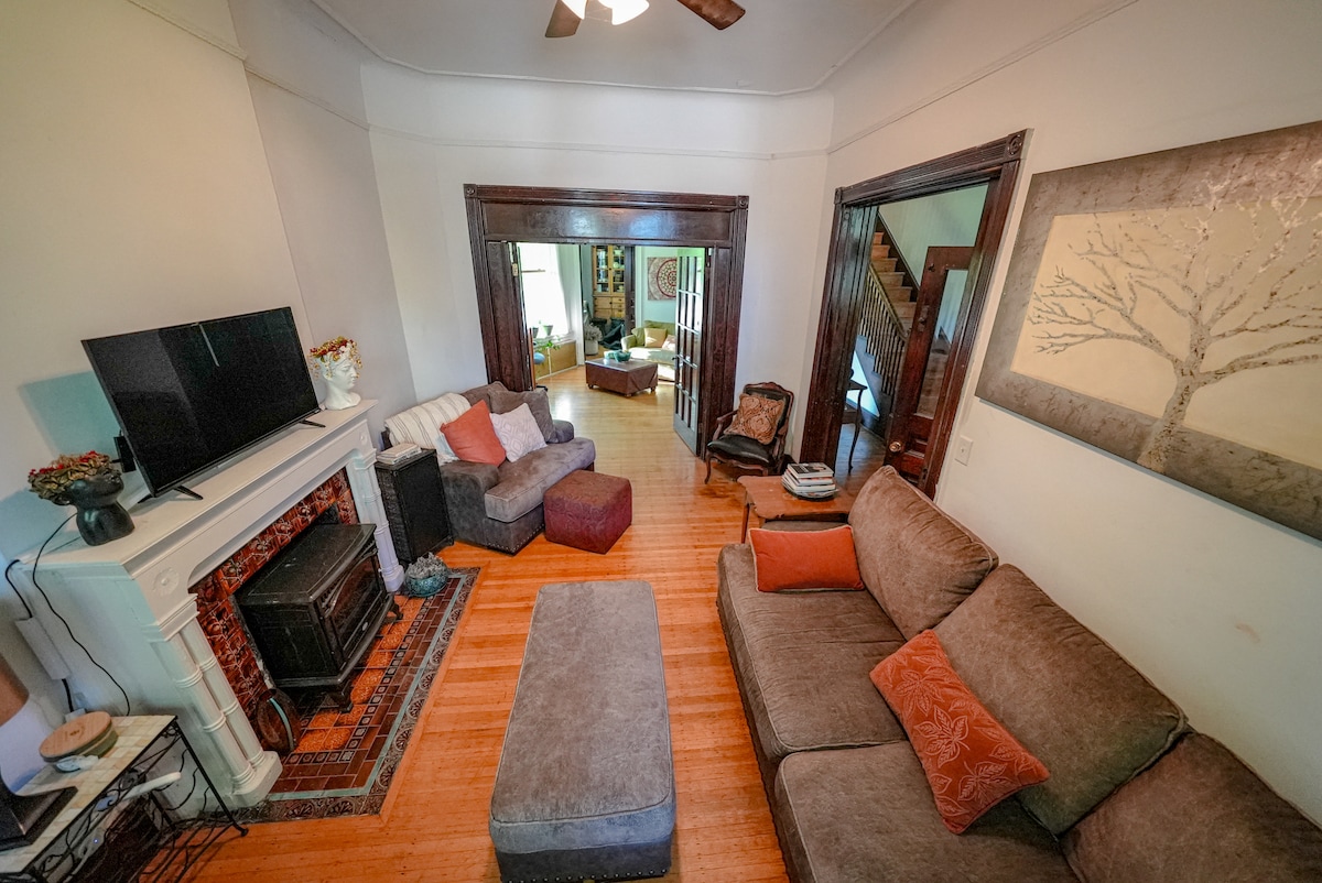 Stay in a landmark 175 yr old Bronzeville Brownstone reimagined by a Chicago nurse as a serene retreat—with hot tub under string lights, Sauna, exercise equipment, hammock swing, Blackstone grill, fire pit and an outdoor bar. Minutes to McCormick Place, Soldier Field, Museum Campus, White Sox Rate Field and 31st Street Beach. We are a quick 15 minute train ride from downtown with train station 2 blocks away. Walking distance to cafes, free street parking in a quiet neighborhood.