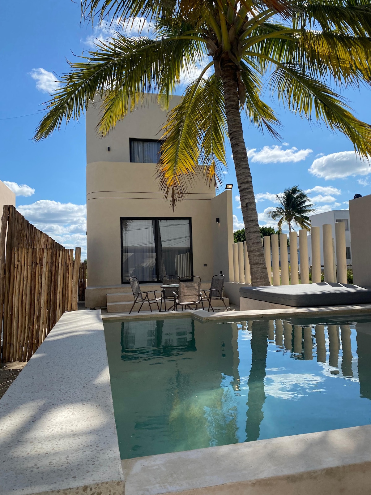 Magrelaks sa lugar na ito ng katahimikan at kagandahan, na idinisenyo para mabigyan ka ng karanasan ng pagkakaisa at kapayapaan na magpaparamdam sa iyo na komportable ka. Bahay na ginawa para makapagpahinga ka at makalimutan mo ang pang - araw - araw na pamumuhay, at ganap na masiyahan sa iyong mga bakasyon. Idinisenyo ang bawat detalye para makapagbigay ng hindi malilimutang pamamalagi. 30 minuto mula sa Mérida, 4 na minuto mula sa beach, 15 minuto mula sa Progreso at 10 minuto mula sa Isla Columpios, ang bahay na ito ay ang perpektong lugar para mag - explore at mag - enjoy sa rehiyon.