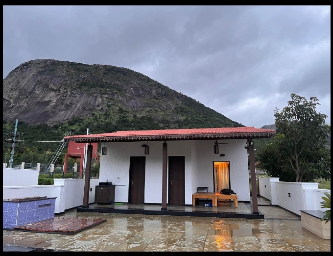 A beautiful cabin villa with 6-seater jacuzzi that sits amidst the serene ambience of Nandi Valley & the surrounding foothills. With its lush green forest cover & dense greenery all around. This unique Pre-engineered cabin Haus can play host to small family gatherings, weekend getaways and a peaceful homestay experience with authentic food available as add-on. Equipped with luxurious rooms, spacious sit outs, meditative garden spaces and a view to kill for - from the open-air balcony and patio.