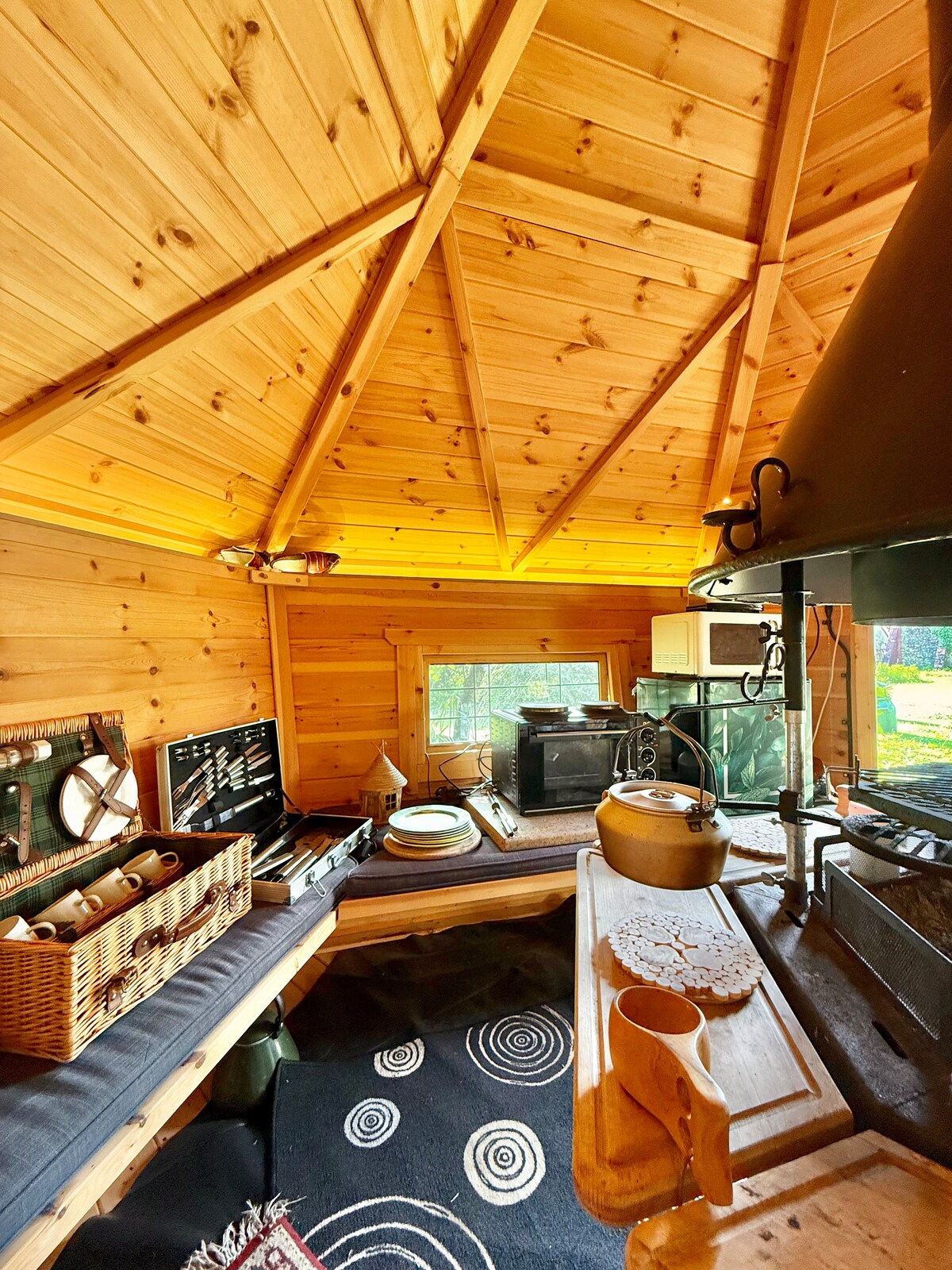 Ang perpektong pagtakas, dumating at mag - enjoy sa mga pribadong pasilidad sa isang payapang lokasyon. Matatagpuan ang kubo sa 22 ektaryang kakahuyan sa gitna ng bukid ng aming pamilya. Napapalibutan ng kalikasan, magpahinga at mag - enjoy sa mga tanawin at tunog ng aming lokal na wildlife. Sa maaraw na gabi, magrelaks sa veranda kung saan matatanaw ang lawa o sumiksik sa harap ng wood burner pagkatapos ng isang araw ng paggalugad.