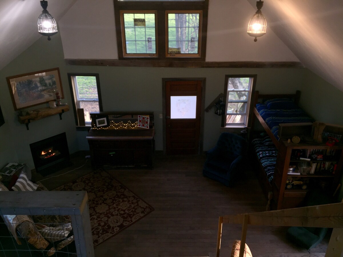 Ang Summer Kitchen ay isang naibalik na gusali sa aming makasaysayang lugar sa bukid. Ang open - concept space na ito ay may kusinang may gas stove, at nakaboteng tubig. May 2 higaan sa itaas sa loft area. Tunay na bukid kami, walang kurtina sa mga bintana dito! Matatagpuan sa gilid ng bakuran sa bukid na may lugar na may kagubatan at trail. Propane - heated shower, at toilet ng bangka. Karanasan sa bukid. Deck/Firepit/upuan na may firewood sa malapit.