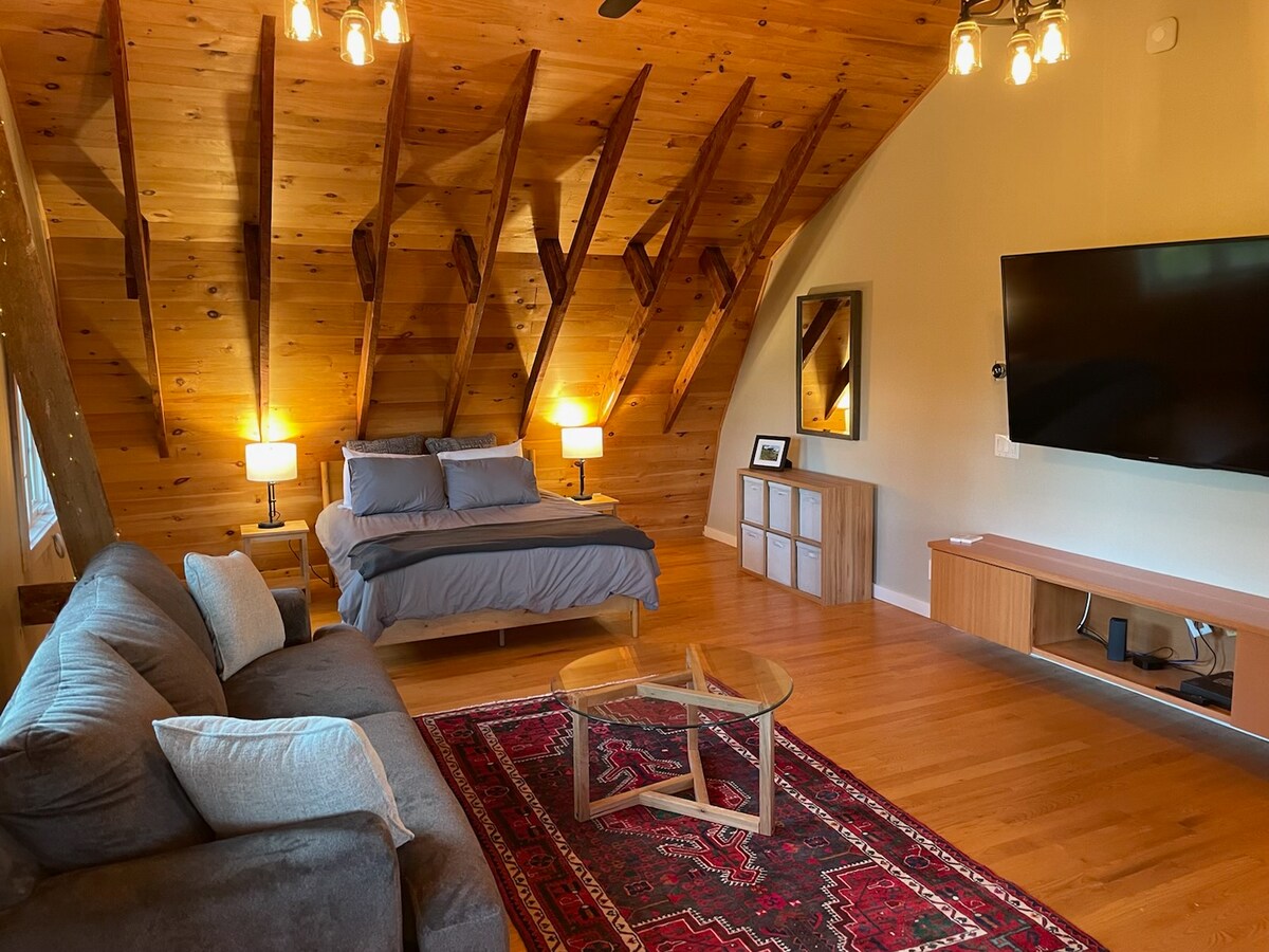 Cozy barn, gas fireplace, fast WiFI in a peaceful wooded forest. Whether sipping coffee by the fire, spinning vinyl records or stargazing by the fire pit(wood provided), this is your space to disconnect or work remotely in comfort. Explore on-site hiking trails, snowshoe and spot wildlife. A short drive from breweries, restaurants, scenic hikes & towns. A perfect mix of seclusion & convenience, 35 mins to Burlington. Perfect for couples/solo travelers/anyone looking for a private nature escape.