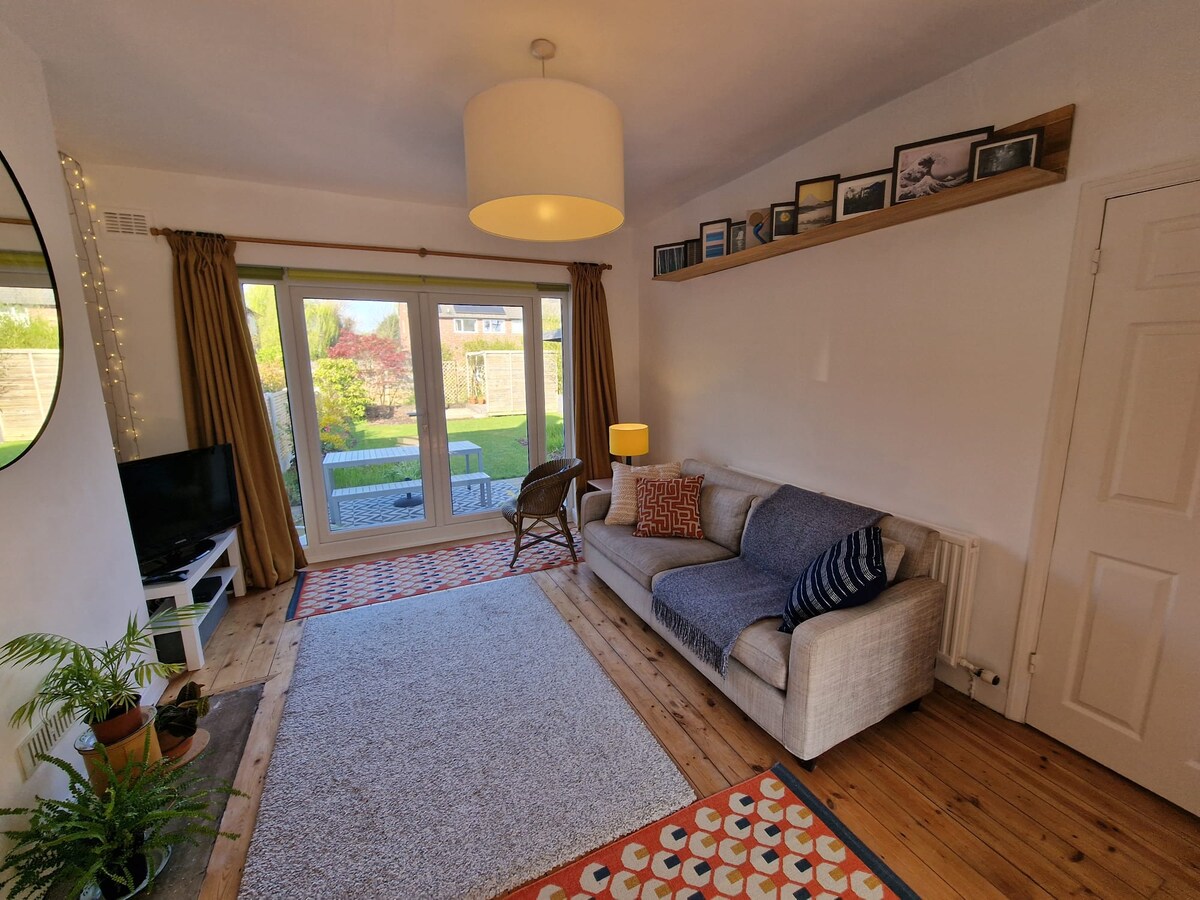 Mapayapa at magaan na 2 - bed na tuluyan sa gitna ng berdeng Chorlton🌳 sa South suburb ng Manchester Magandang ipinakitang property mula sa dekada 1930 na may pribadong maaraw na hardin, open living/dining area, at masiglang kombinasyon ng moderno at vintage na dekorasyon at muwebles. Kasama ang 2 silid - tulugan, nakatalagang workspace, kusina at banyo, at libreng paradahan. Maikling lakad lang papunta sa mga cafe, parke, at pampublikong transportasyon na may madaling access sa sentro ng lungsod ng Manchester.