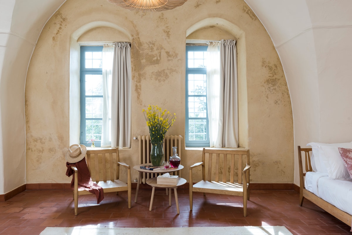 Maligayang pagdating sa Beyt el Jabal. Isang natatanging retreat na matatagpuan sa gitna ng makasaysayang Deir el Qamar. Inaanyayahan ka ng aming tahimik na boutique hotel na magpahinga sa iyong pribadong suite, na idinisenyo para sa kaginhawaan at kagandahan. Komportableng vaulted na silid - tulugan na may komportableng double bed. Pribadong banyo na may mga pangunahing kailangan. Napapalibutan ng mga maaliwalas na hardin at malalawak na bundok. Onsite na restawran na naghahain ng tunay na lokal na lutuin. Mainam para sa mga mag - asawa, artist, mahilig sa kalikasan, at mahilig sa kasaysayan. Nasasabik kaming tanggapin ka!