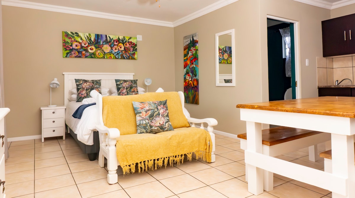 May pribadong pasukan at covered porch ang maluwag at magandang inayos na unit na ito. Moderno ito na may bukas na plan living area. Nag - aalok ang unit na ito ng buong DStv, Netflix, at WiFi. Ang mga de - kuryenteng kumot ay ibinibigay para sa mga sobrang lamig na gabi ng taglamig. Ang kusina ay kumpleto sa refrigerator, microwave at lahat ng iba pang mga aparato na kinakailangan. May ibinibigay na mga pangunahing gamit sa unang umaga. Naglalaman ang banyo ng shower, palanggana at toilet. May access ang mga bisita sa mga ligtas na paradahan at braai facility. Matatagpuan malapit sa mga tindahan at restawran.