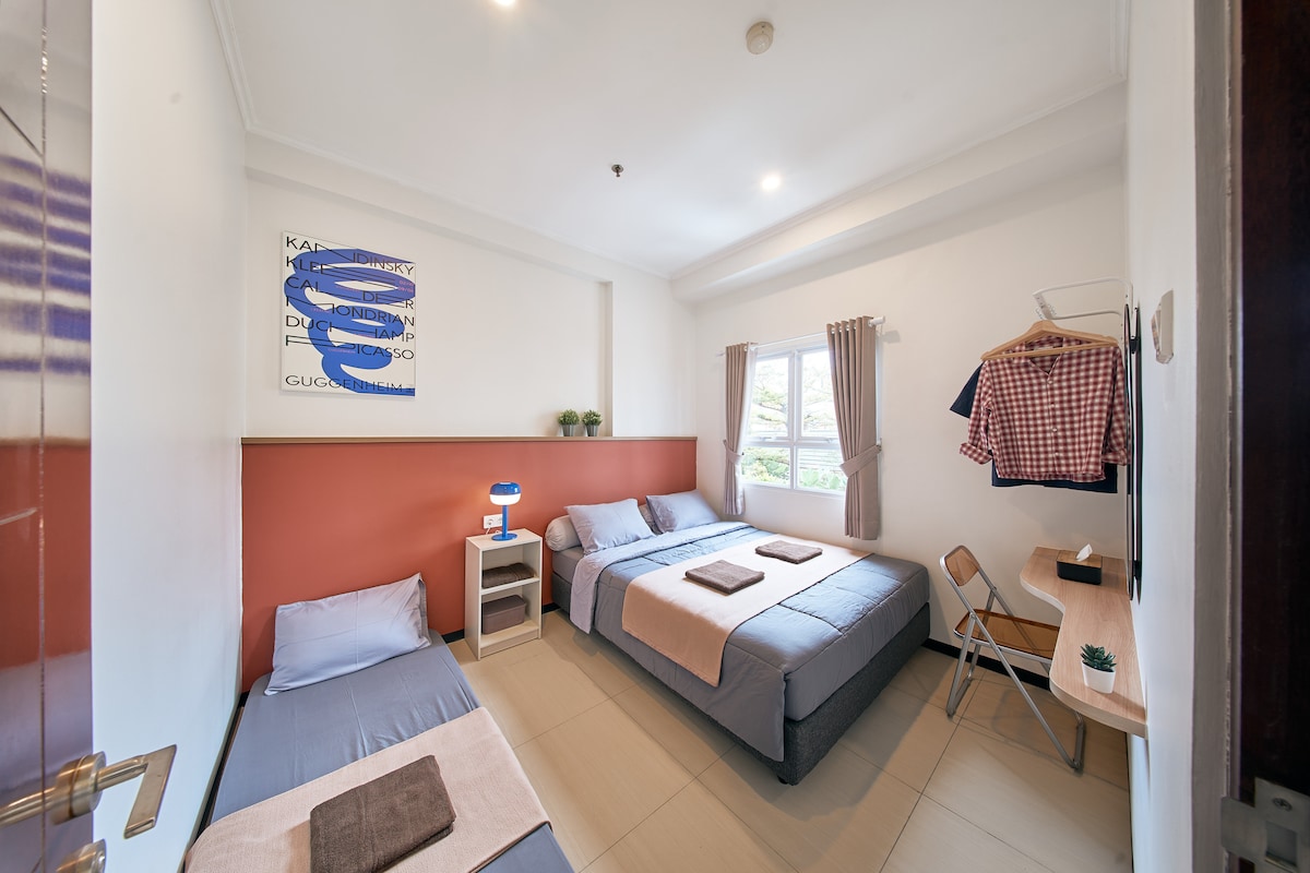 Gumawa ng ilang Natatanging alaala sa komportable at pampamilyang Apartment na ito sa Gateway Pasteur. Maluwang na 2 silid - tulugan para komportableng mapaunlakan ang katamtamang laki ng mga holiday ng pamilya o ilang kaibigan sa Bandung🏡❤️ Matatagpuan sa gitna ng Lungsod ng Bandung, malapit sa exit ng Toll Pasteur Kumportableng umangkop sa maximum na 7 hanggang 8 tao, kasama rito ang mga bata. 2 silid - tulugan at 1 Banyo lang Napapalibutan ng Cafe, Resto, Mini Market May Bayad na Paradahan sa Paradahan ng Apartment (kada oras na 3k, at 40k magdamag)
