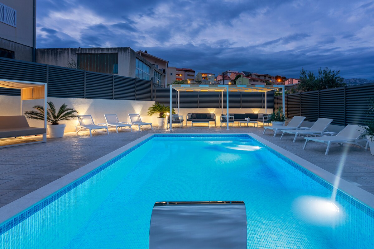 Nag - aalok ang "GREEN DREAM" ng accommodation para sa 12 tao. Dalawang marangyang, moderno at kumpleto sa gamit na apartment na may 5 silid - tulugan, nag - aalok ng access sa outdoor terrace na may sariling vintage kitchen, toilet, maliit na gym, at espasyo para sa kasiyahan na may billiard. Ang kapitbahayan ay lubos na walang ingay ng kotse. Mula sa terrace ay may access sa pool at magandang malaking hardin na may kaakit - akit na gazebo na natatakpan ng mabangong jasmine. 4 na km lang ang layo ng property mula sa sentro ng Split at Diocletian's Palace!