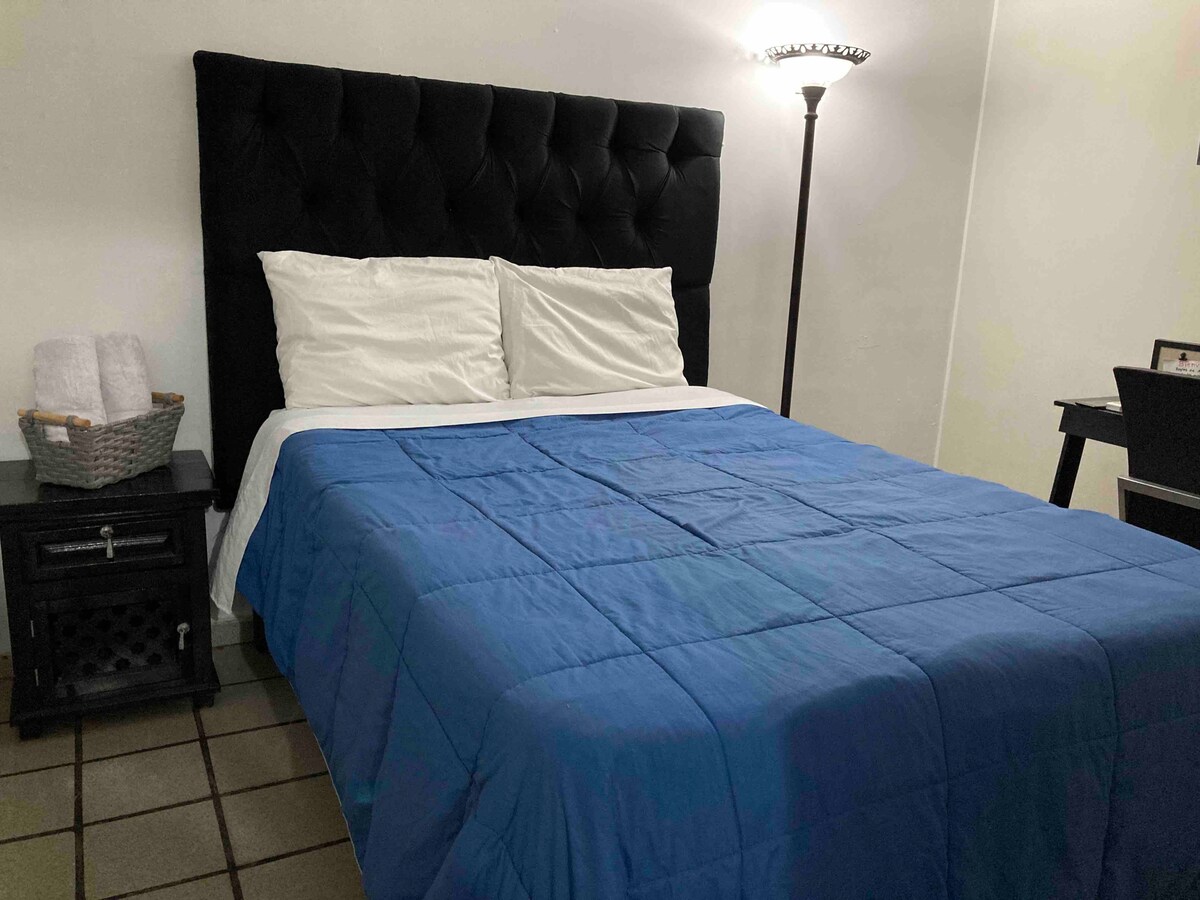 Ubicado en el centro de la ciudad a una cuadra del Hospital San Jose. Cuenta con baño privado dentro del departamento y esta equipado con cómoda cama matrimonial de memoryfoam, cocineta, internet de buena calidad, smart TV Roku ... Ideal para viajes de trabajo(facturamos). Contamos con servicio de transporte(costo extra).