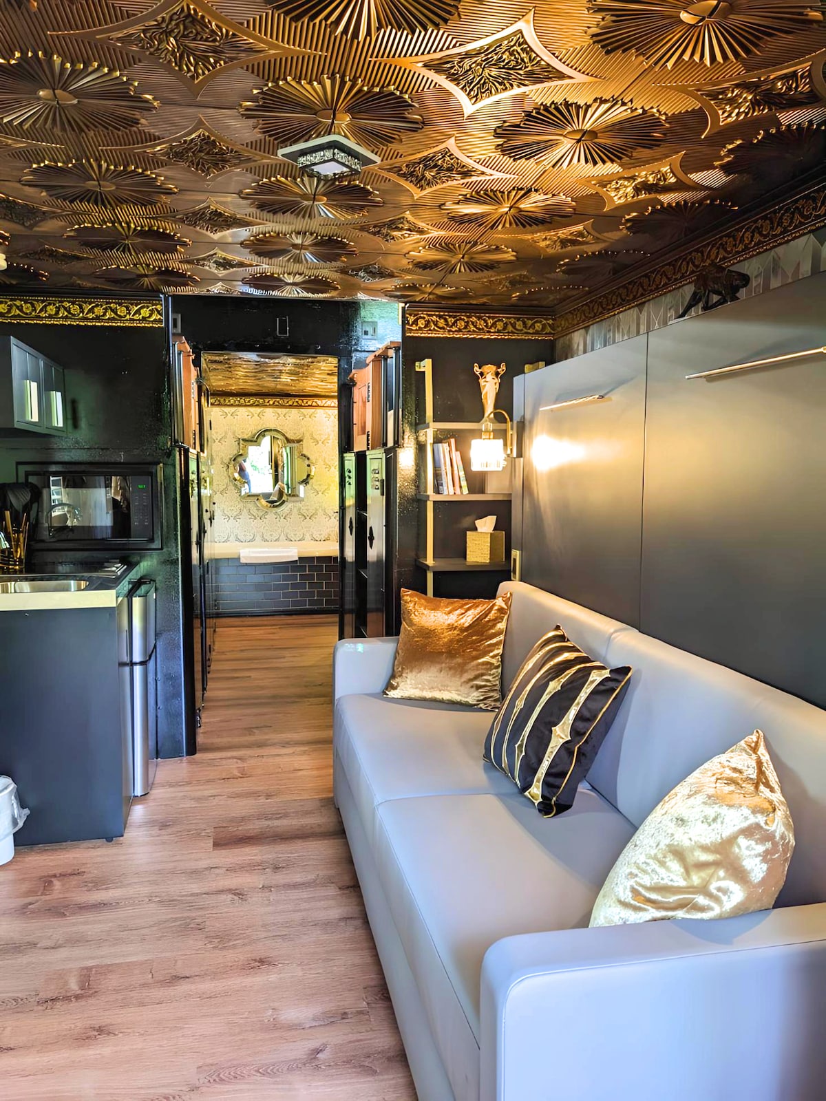 Embark on a journey of opulence and style aboard the Orient Express, the epitome of luxury travel. Our 1920s Art Deco train car, gleaming in its black and gold accents, will captivate you from the moment you step onboard. Experience the ultimate in indulgence with a curated collection of vintage vinyl records, a pampering private whirlpool tub and sophisticated interior lighting. Embrace the timeless charm of train travel as you embark on an unforgettable adventure with the Orient Express.