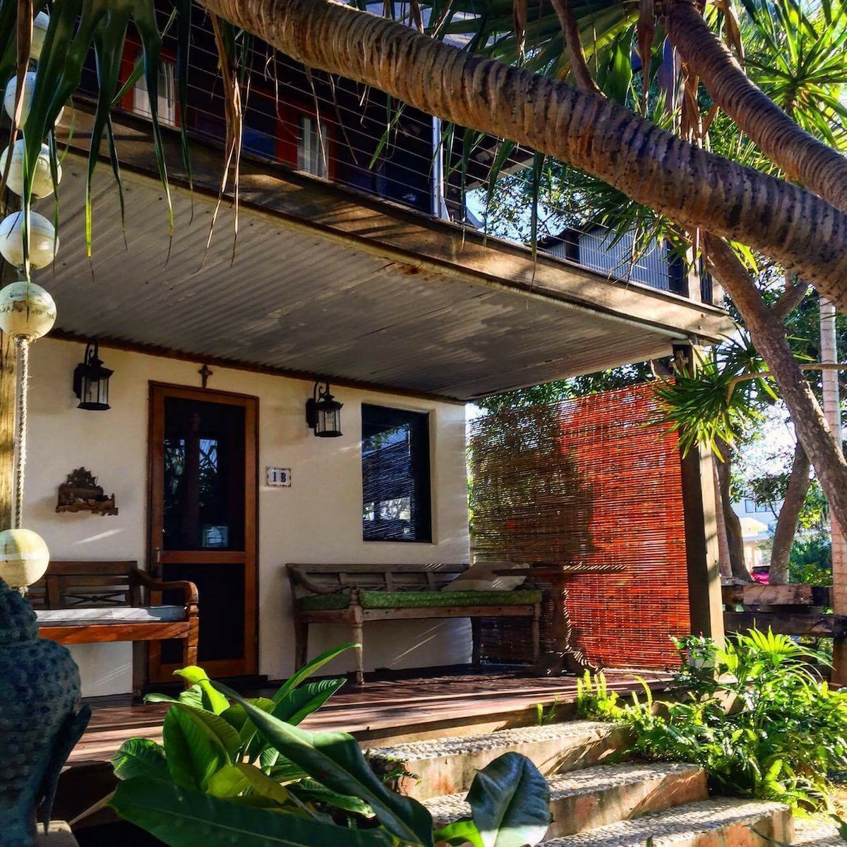 Modernong bagong studio sa tapat ng Belongil Beach na may maikling 10 minutong lakad papunta sa bayan at 3 minutong lakad papunta sa sikat na Treehouse restaurant at bar. May hiwalay na pasukan ang studio mula sa pangunahing bahay. Ang kusina ay may buong refrigerator, hot plate, microwave ( matatagpuan sa aparador sa itaas ng refrigerator) at air fryer. May mini weber bbq para sa paggamit ng bisita. Nasa cabin na ito ang lahat ng kailangan mo para sa magandang bakasyon sa tabing - dagat kabilang ang aircon at fan.