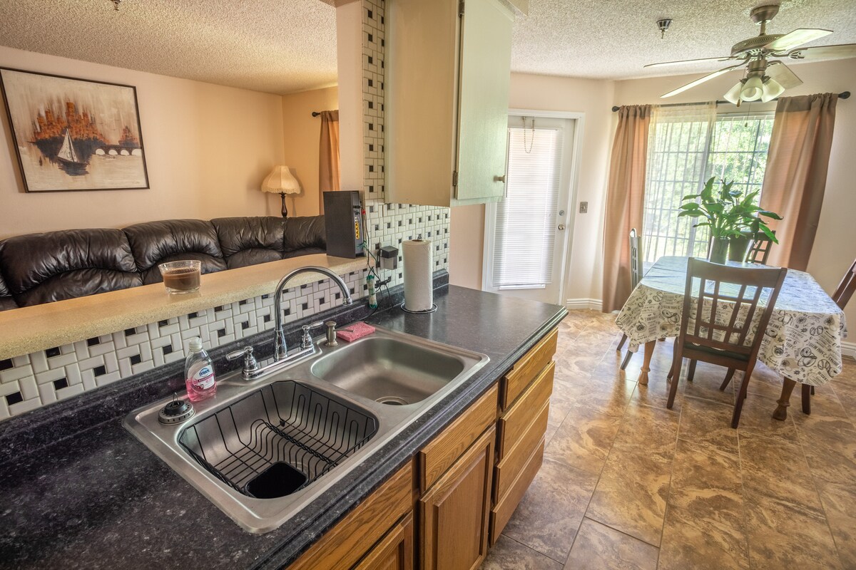 Inaalok sa iyo ang buong isang palapag na bahay. Isang palapag na bahay ang kamakailang na - renovate na bahay na ito na may 4 na silid - tulugan at 2 banyo. May magagamit na driveway para sa paradahan na may espasyo para sa 3 kotse, at may higit pang espasyo sa kalsada. Mamahaling likod - bahay na may hot tub at ihawan pati na rin ang gazebo na may beranda. Makikita mo sa patyo ang hapag - kainan para sa 6! Ilang minuto lang ang layo ng mga restawran at grocery store. High speed internet na may WiFi hanggang sa 1 GB/s at pool table