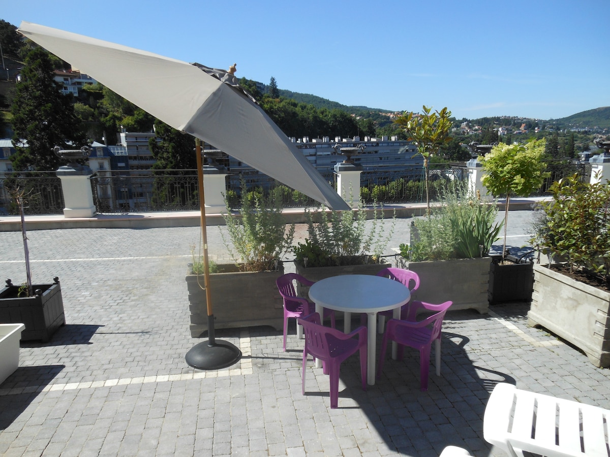 Matatagpuan ang apartment 20 metro mula sa Royat thermal establishment, 50 metro mula sa ROYATONIC thermoludic at wellness center, wala pang 10 minutong biyahe mula sa Puy de Dôme at Vulcania, at 5 minuto mula sa sentro ng Clermont - Ferrand. Magugustuhan mo ang lugar na ito dahil sa matataas na kisame, tanawin, at kaginhawaan. Ito ay perpekto para sa mag - asawa, solong biyahero, business traveler at pamilya (na may mga anak).