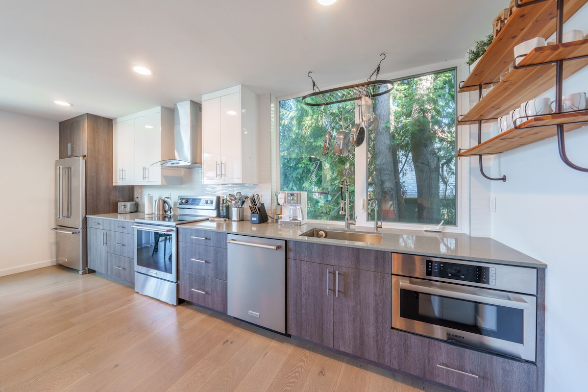 May 17 bintana at 4 skylight ang modernong 900 sq ft na tuluyan na ito na nagbibigay‑liwanag at may magandang tanawin ng mga pine tree na nakapalibot sa tubig. Mag-enjoy sa 2 minutong lakad papunta sa beach at 10 minutong lakad papunta sa Battle Point Park. Magrelaks sa panloob na sauna, mag - enjoy sa sobrang laki ng rain shower gamit ang wand ng kamay. Banyo na may double vanity at radiant floor heating. Mag-enjoy sa pagluluto/pag‑entertain sa kusinang kumpleto sa kagamitan na may malaking island bar, gas cooktop ng chef, double oven, at full‑sized na refrigerator/freezer. Huwag magdala ng maraming gamit! May washer/dryer.