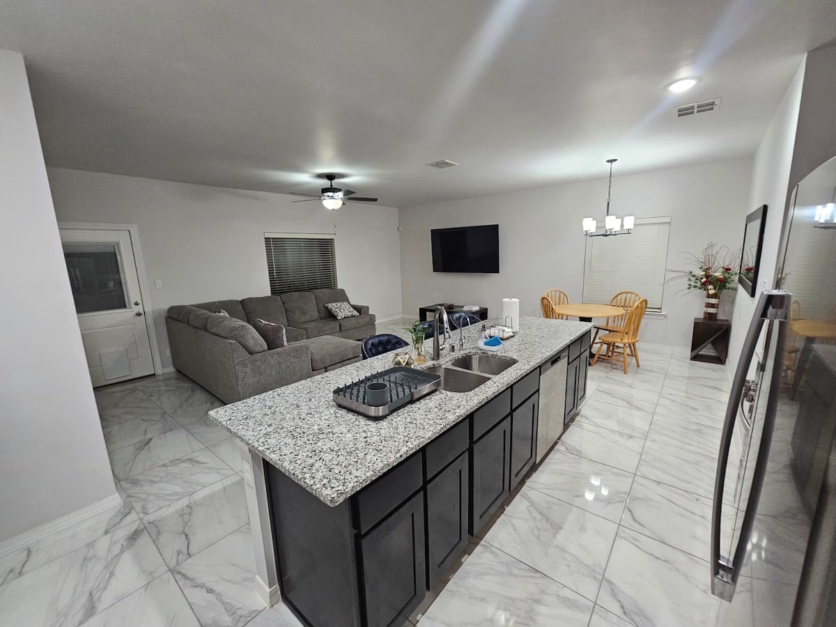 Welcome sa maluwag at maestilong 4BR, 2.5BA na tuluyan na perpekto para sa mga pamilya, business traveler, medical staff, at pangmatagalang pamamalagi. Mag‑enjoy sa malawak na sala na may malaking sectional, 65" na Smart TV, at modernong dekorasyon. May granite counter, stainless appliance, at malaking island sa kusinang kumpleto sa gamit. Sa itaas, may komportableng higaan, mga faux wood blind, at Smart TV sa bawat kuwarto. Matatagpuan sa ligtas at tahimik na kapitbahayan malapit sa shopping, kainan, I‑10, mga ospital, at Eastlake Marketplace!