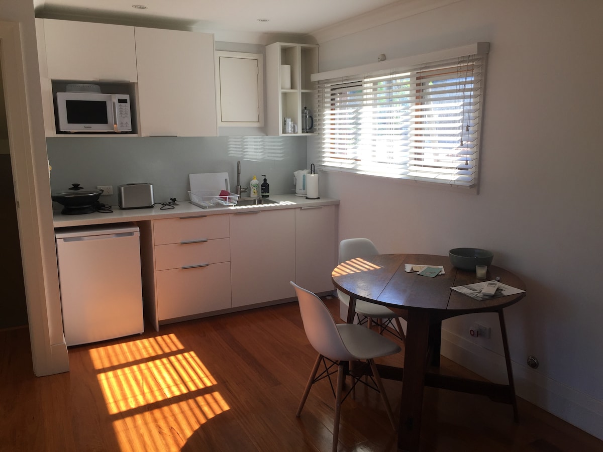 Everyone who stays comments on how calm and zen the studio feels. The open-plan space features a well-equipped kitchen at one end and a comfortable living and sleeping area at the other. There’s a separate bathroom with a shower and laundry facilities for your convenience. Off the kitchen, a door opens to a small private patio — perfect for morning coffee or quiet relaxation. You’ll enjoy full privacy throughout the studio. The space is very private and quiet with afternoon sun.
