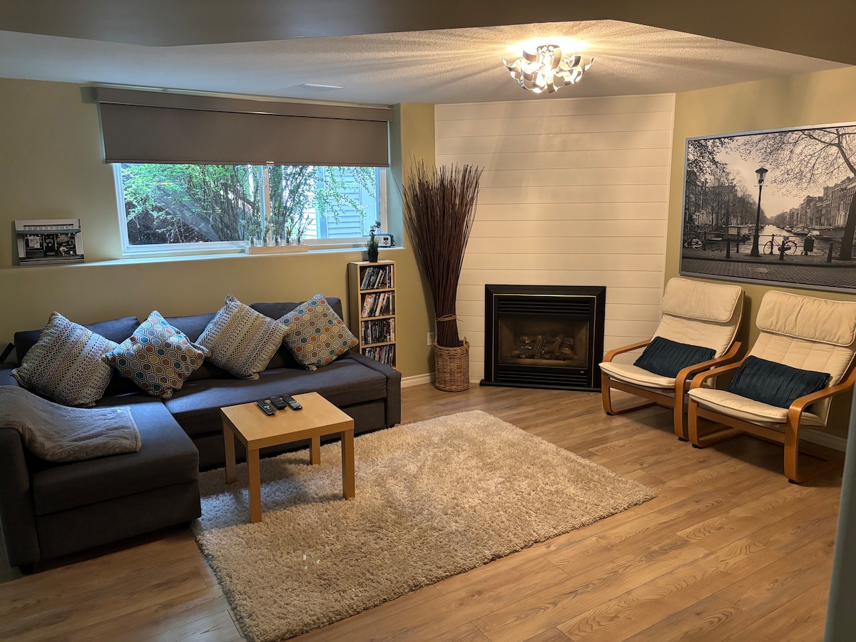 830 Sqft Legal Basement Suite, Private southern-exposed patio, Modern kitchen, Comfortable King bed plus a portable, inflatable queen mattress. The unit stays cool in the summer and can be toasty in the winter with the gas fireplace! Newer family neighborhood. Fast internet with Cable TV, Self contained with extensive sound proofing on all ceilings and partition wall, Clean, quiet and private.