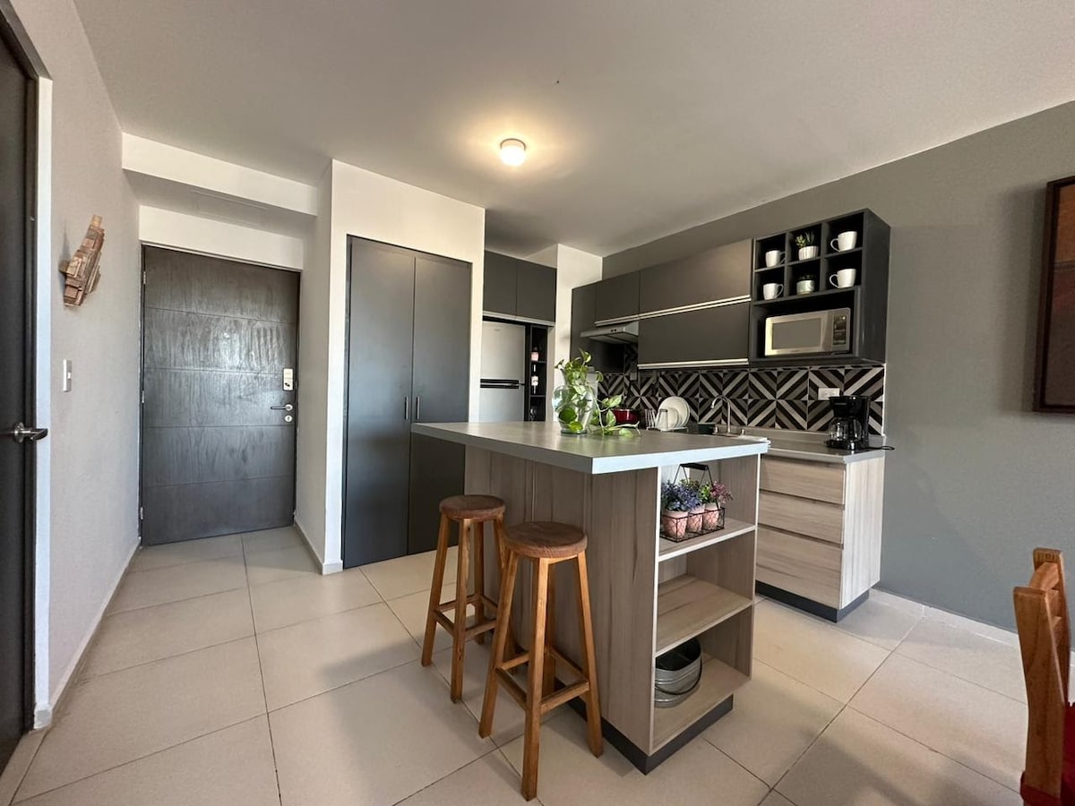 Magandang apartment na ganap na binago sa pinakamagandang lugar ng San Pedro Garza Garcia. Praktikal na bago ang lahat (mga higaan, sapin, kutson, blind, ref, washer, dryer, sala, silid - kainan, kasangkapan, klima). Mayroon itong Wifi, smart TV na may 80 channel, mini - split sa bawat kuwarto at magandang balkonahe na may magagandang tanawin ng lugar ng hotel.