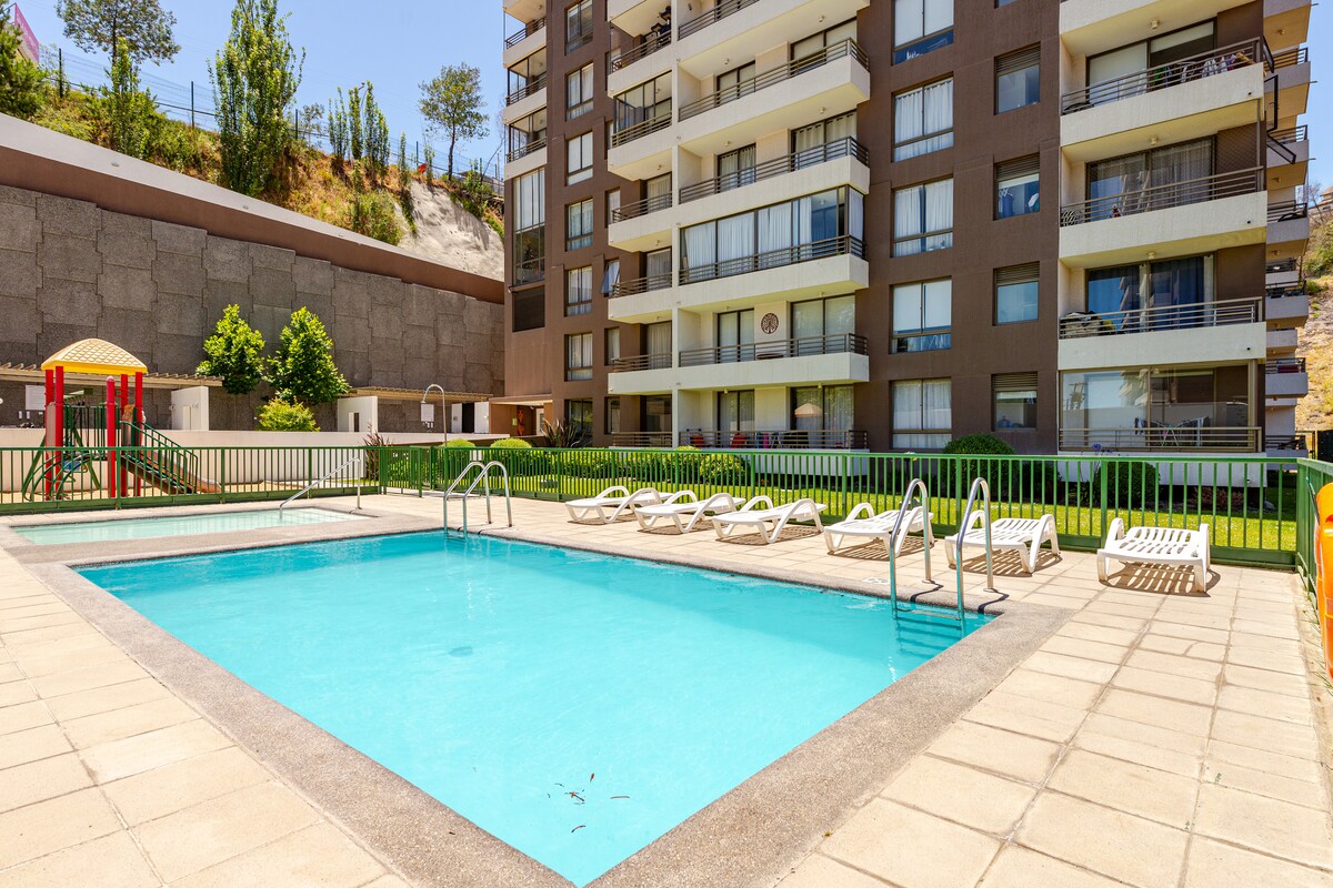 Ang apartment ay moderno na matatagpuan sa isang mataas na palapag kaya mayroon itong kamangha - manghang tanawin. Ang pampublikong transportasyon ay ilang hakbang ang layo mula sa pangunahing kalye 1 hilaga at puno ng kahoy na kalsada, sentro ng lungsod, supermarket at unibersidad. (U Federico Sta Maria & Sto Tomas). Tahimik ang kapitbahayan, perpekto para sa mga mag - asawa, na may balkonahe at pribadong pool. Dept nang walang heating. Mga Distansya: ■ 15 - 20 minutong paglalakad. Super JUMBO. ■ 15 minuto mula sa beach at casino sa sasakyan. ■ Carport