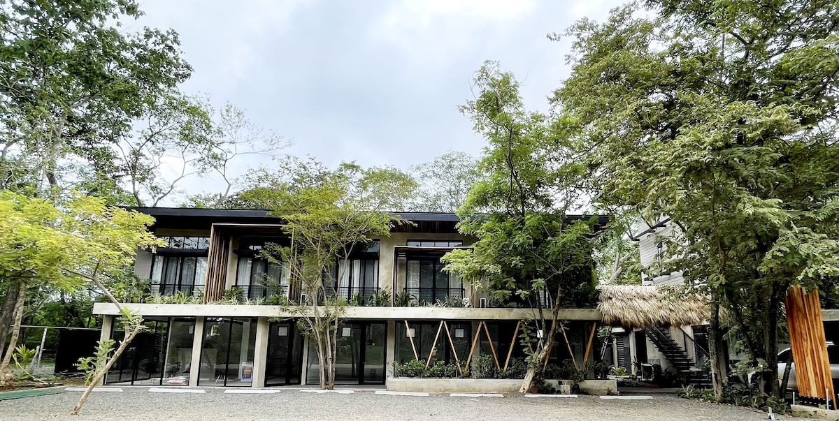 Idinisenyo ang aming Queen Room para mapalabas ang init, na nagtatampok ng mga bintanang salamin na nag - iimbita sa nakapaligid na kalikasan sa loob. Pinalamutian ng mga likas na materyales at mataas na kisame, nag - aalok ito ng natatanging karanasan sa loob - labas. Napapalibutan ng mga halaman, isawsaw ang iyong sarili sa tahimik na kapaligiran. Kumpleto sa pribadong banyo, TV, desk, AC, ceiling fan, mga amenidad sa shower, at serbisyo sa hotel. Bukod pa rito, puwede itong kumonekta sa kalapit na kuwarto para gumawa ng mga suite para sa apat na tao. Malugod na tinatanggap ang mga pups sa sarili nilang komportableng higaan.