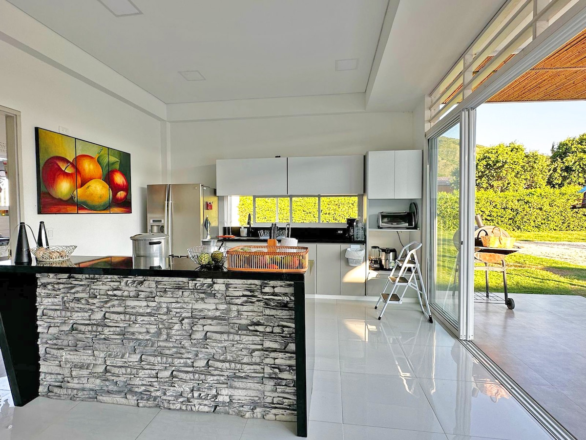Isa sa mga pinakamagagandang bahay sa lugar, isang kamangha - manghang disenyo na may modernong estilo, isang magandang tanawin na perpekto para sa pagrerelaks. Mayroon itong maluluwag na lugar, napakagandang banyo, ang pangunahing may double shower at isa sa mga ito sa labas, bukas na kusina, palaruan , portable sound baffle, WiFi, pool na may Jacuzzi, at lugar na may barbecue. Mga tennis court (karagdagang bayad sa condo), mga lawa at napakahusay na lugar para sa paglalakad at pag - eehersisyo. carrogolf (inuupahan ng third party).