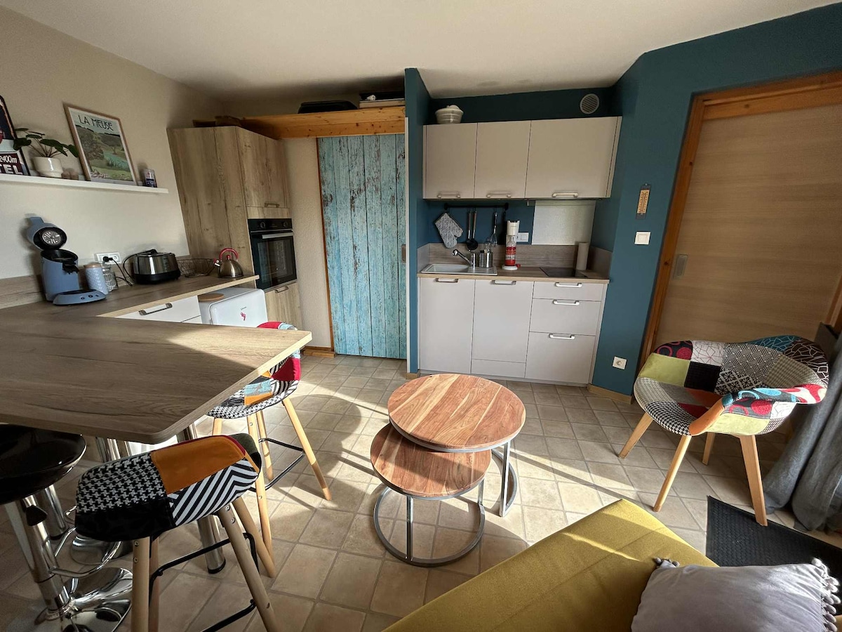 Studio rénové comprenant un confortable canapé lit pour 2 adultes et 2 lits superposés pour 2 enfants. Ce logement dispose d'une cuisine équipée, d'une salle d'eau et d'un WC séparé. Vous pouvez profiter pleinement du balcon avec 2 transats et une table d'appoint avec vue sur la montagne. Le logement en haut de l'ancienne station drouzin le mont et au des sentiers de randonnées. C'est un endroit idéal pour profiter de vacances ressourçantes et au calme, proche de la nature.