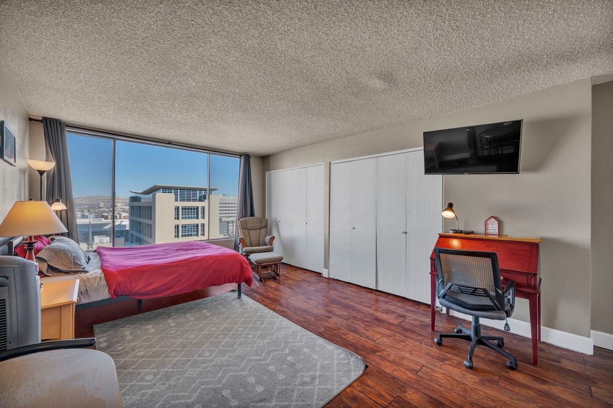 Matatagpuan sa gitna ng downtown Reno, ang River View B ay isang efficiency unit sa napakataas na palapag ng mga hinahangad na Park Towers condo. Ang napakagandang tanawin ng Truckee River (mula sa kuwarto at rooftop deck), kamakailang pagsasaayos ng yunit na may mga modernong kasangkapan, WiFi, smart TV, at kitchenette ay ginagawa itong isang perpektong pansamantalang pabahay para sa mga naglalakbay na propesyonal o para sa isang bakasyon sa katapusan ng linggo. Ang Park Towers ay 2 bloke lamang mula sa mga restaurant, bar at shopping ng Reno; ang midtown ay mas mababa sa isang milya ang layo.