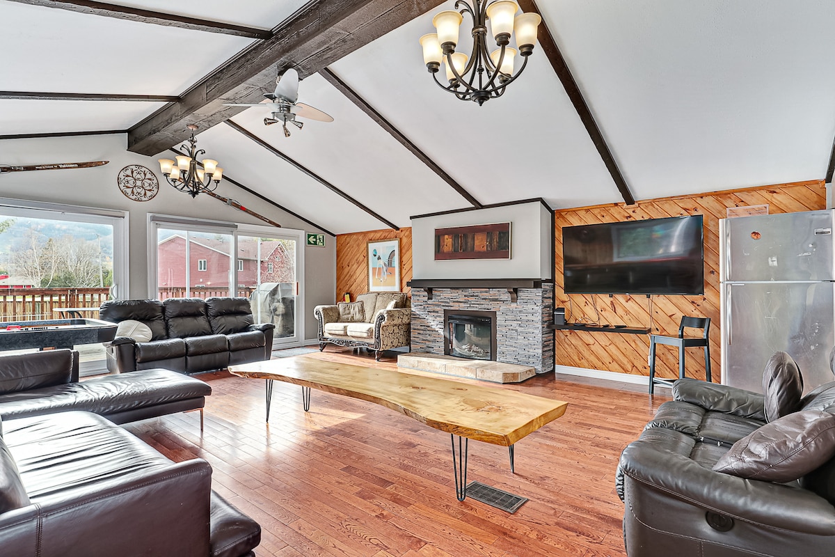 13 minuto lang ang layo ng ski lift sa chalet na ito na malapit sa ski slope. Mayroon kaming mga outdoor Hot Tub, indoor Sauna, at mga libangan tulad ng Pool Table, mga video game at isang malaking 75 inch HD TV para sa iyong mga gabi ng pelikula. Palibutan ang iyong mga kaibigan/pamilya sa paligid ng aming inayos na Kusina, malaking Centre Island at malaking Hapag‑kainan. Umupo sa aming may bubong na Sunroom para magkape sa umaga o mag‑barbecue sa buong taon. Huwag mag-alala at iwanan ang iyong mga kotse sa aming tahanan: 7 min lang ang layo sa Village