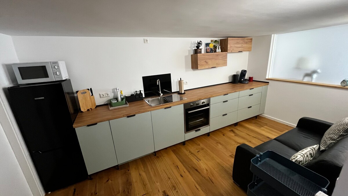 3 - room apartment. Ang living room area ay may kusinang kumpleto sa kagamitan sa modernong estilo na may dining area. Sa dalawang silid - tulugan ay may mga double bed at sapat na espasyo para sa dagdag na kama. Ang mga wardrobe sa bawat silid - tulugan ay nagbibigay ng espasyo para sa iyong bagahe. Nilagyan ang maaliwalas na sala ng sofa couch at TV. Nag - aalok ang hardin na may tanawin ng Rhine Valley ng fireplace corner at barbecue, standing pool, at maraming espasyo para makapagpahinga.