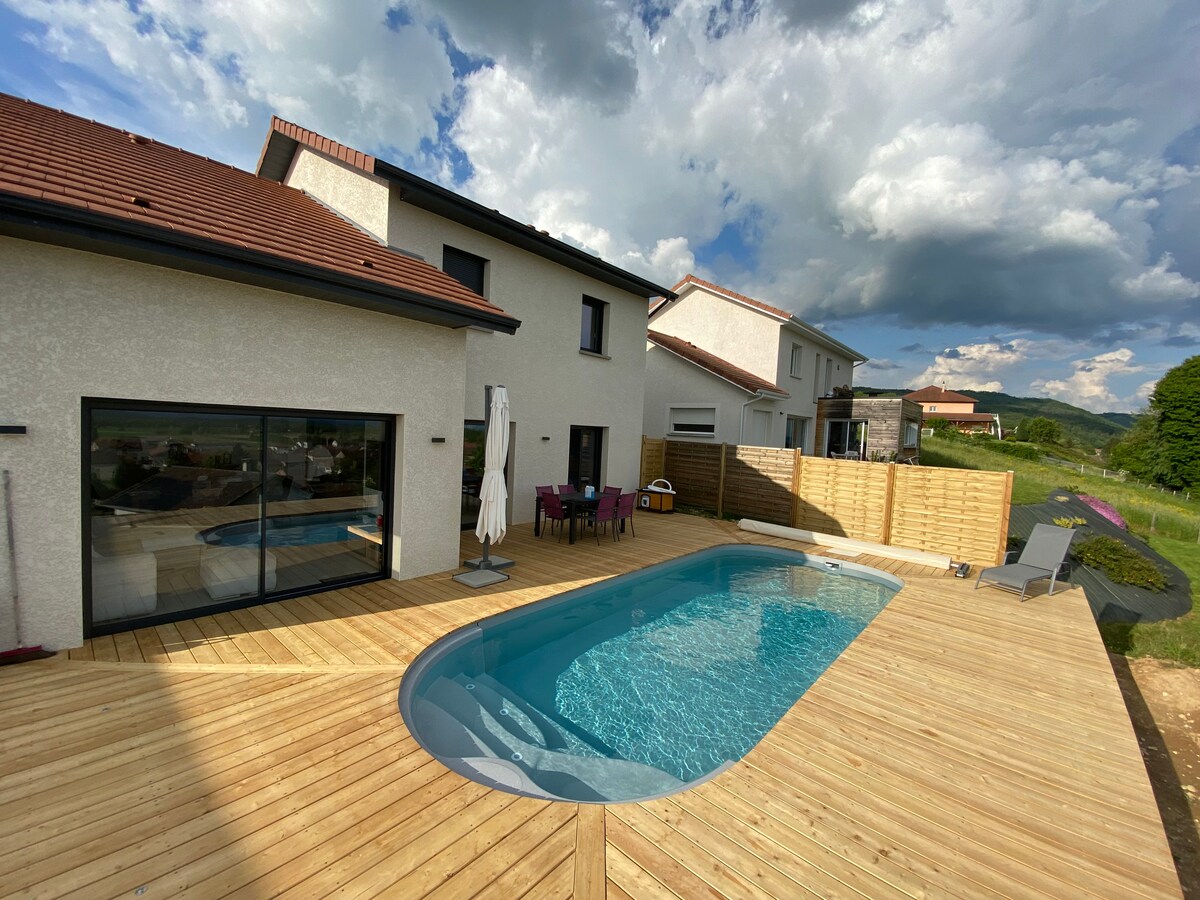 Chalet! May 3250 m2 park na ganap na nakapaloob at pinalamutian ng magagandang puno. Libreng WiFi at AIR - CONDITIONING!!! pinagsamang kusina LV. Wood stove, sofa bed 2p, TV, walk - in shower, towel dryer at washing machine, bawat isa. Marka ng higaan sa 140x190. terrace na may mesa at upuan, muwebles sa hardin, sun lounger, duyan, swing seat, shower sa labas, barbecue, petanque, ping pong table, darts. 1 oras mula sa Lyon,Grenoble, Chambéry, malapit sa A48 motorway, Charavines Lake Paladru 15 m