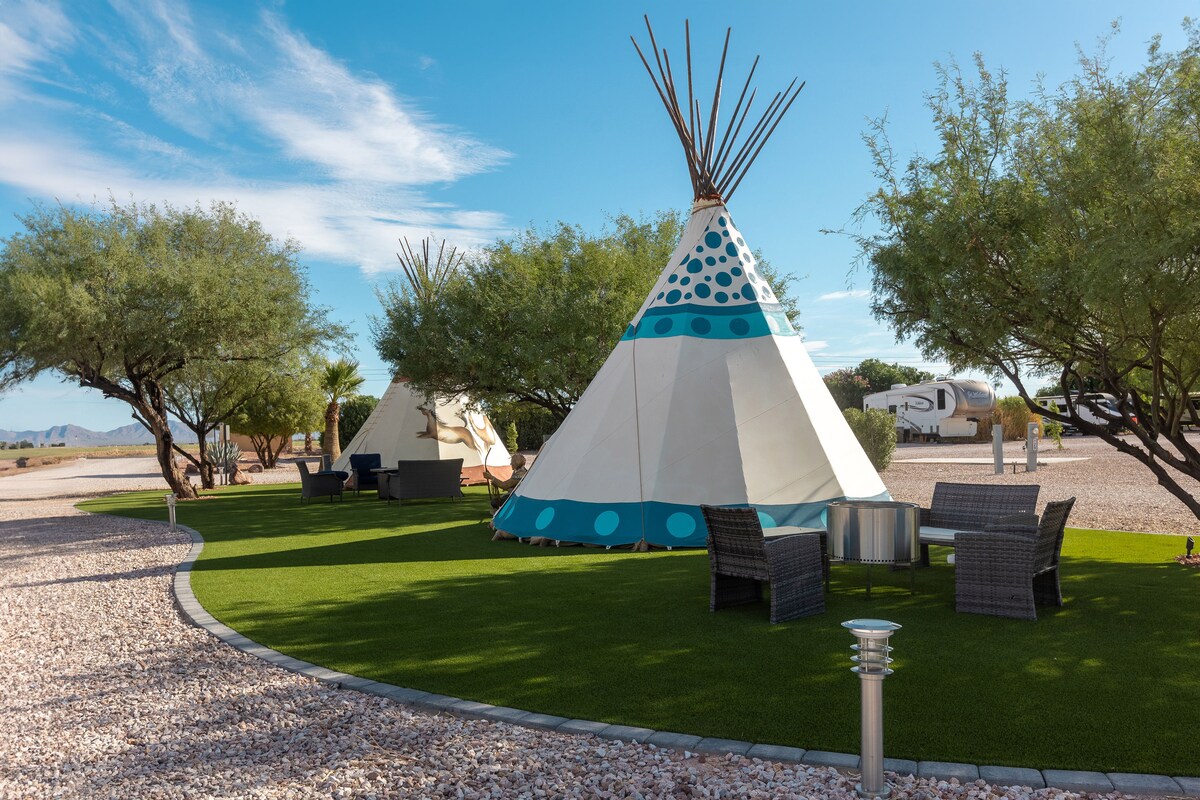 Maligayang pagdating sa aming tahimik na tipis na nasa loob ng kaakit - akit na Indian Hills RV Resort. Ang aming kamakailang binuo tipis ay kamay na ginawa ng mga Katutubong Amerikano. Matatagpuan sa isang pangunahing lokasyon sa loob ng resort, ang aming mga tip ay nag - aalok ng madaling access sa aming mga banyo, shower, pitch at putt golf green, pickleball court, fitness center, nag - iimbita ng mga fire pit, at mga kuwarto sa komunidad na nilagyan ng malalaking screen TV at high - speed internet.