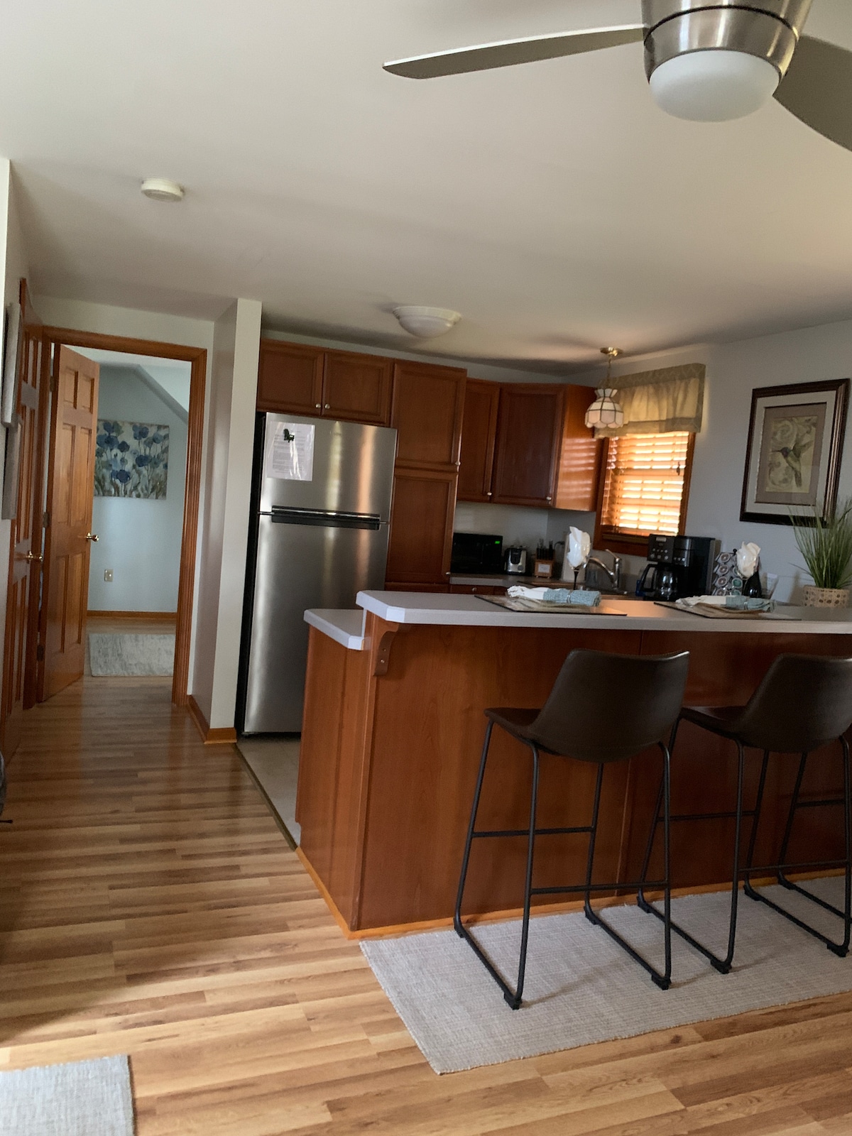 Serene 900 square foot guest cottage located eight miles from Hudson, City center. The guest house is located near the main house and has a private entrance and partially screened-off stone patio—Sunny, bright, cheerful interior with king-size bed. The bathroom has a shower, heated floors, and a washer and dryer. The kitchen has a microwave, refrigerator, coffee maker, toaster, and electric tea kettle.