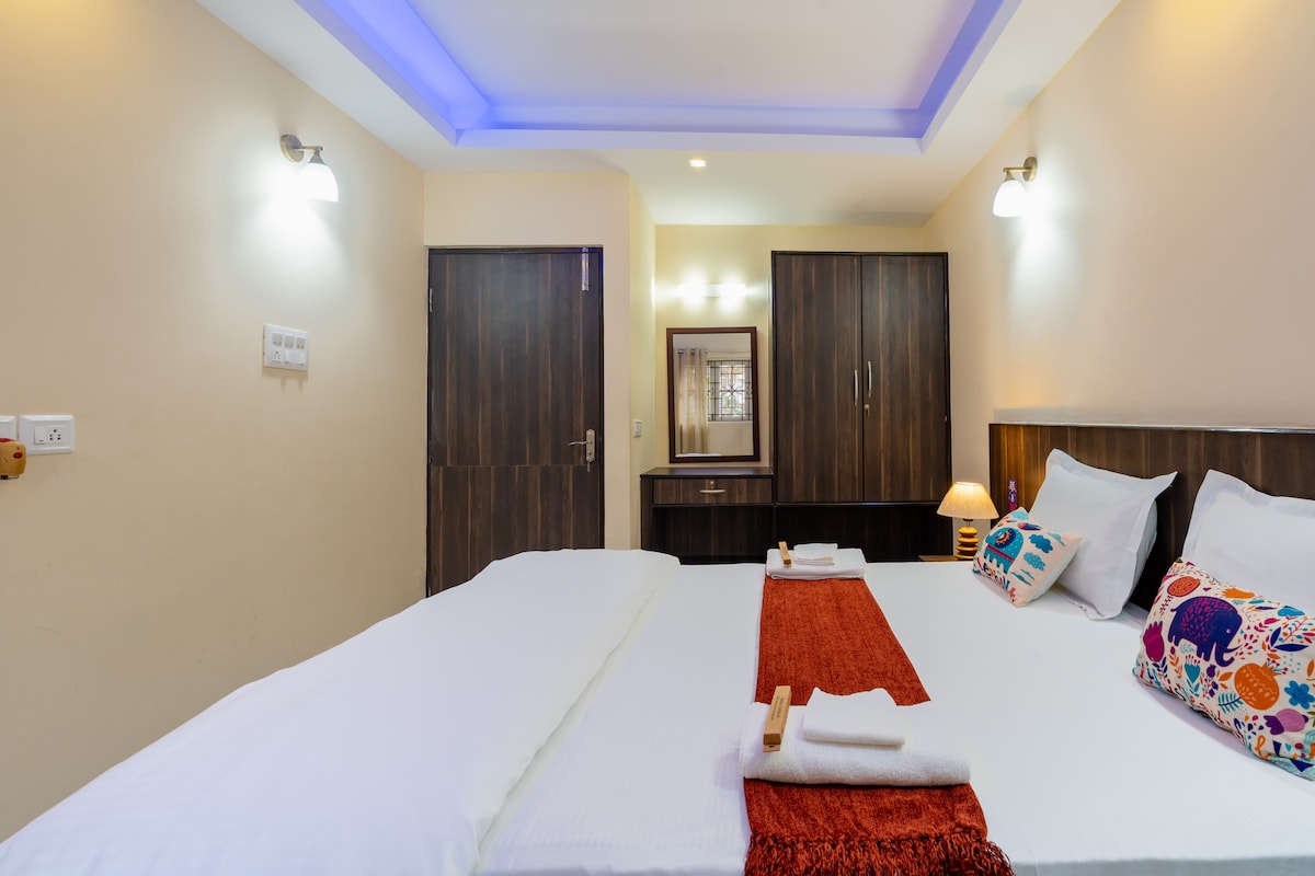 Makaranas ng Kaginhawaan sa Svarupaka Holiday Homes sa Colva Pearl! Mamalagi sa aming Cozy Nook, isang kaakit - akit na 1BHK na 2 minutong biyahe lang o 5 minutong lakad papunta sa Colva Beach. Mga hakbang mula sa mga supermarket, restawran, at merkado, perpekto ang bakasyunang ito para sa mga mag - asawa, solong biyahero, o malayuang manggagawa. Mga Feature: Silid ✔ - tulugan na may air condition Kusina na may kumpletong ✔ kagamitan ✔ High - speed na Wi - Fi ✔ Pribadong balkonahe Access sa ✔ swimming pool at gym Mag - enjoy sa nakakarelaks na bakasyunan sa tabing - dagat!