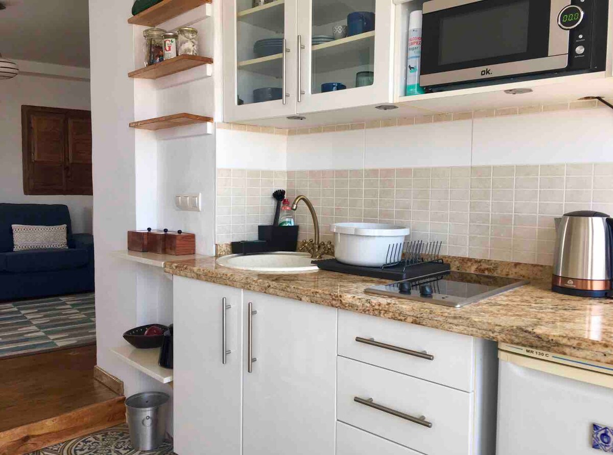 ThinkersINN, matatag na INTERNET, H/OFFICE, Double infinity POOL + Heated jacuzzi. Iniimbitahan ka ng tahimik na oasis Sa gabi, puwede kang mag‑enjoy sa masasarap na pagkaing Andalusian, mga inumin, at musika sa sentro ng lungsod. May 2 studio sa gilid ng Hacienda, at pribado ang pool at para lang sa bahay namin. Ang kuwarto (higaang 2m ang haba), rainforest shower, AC, SmartTV, glassed terrace, kitchenette, Weber gas grill Napakatahimik at pribado ng aming bahay na nasa gilid lang ng sentro at nasa kalsada ng Tarmac na may libreng paradahan.
