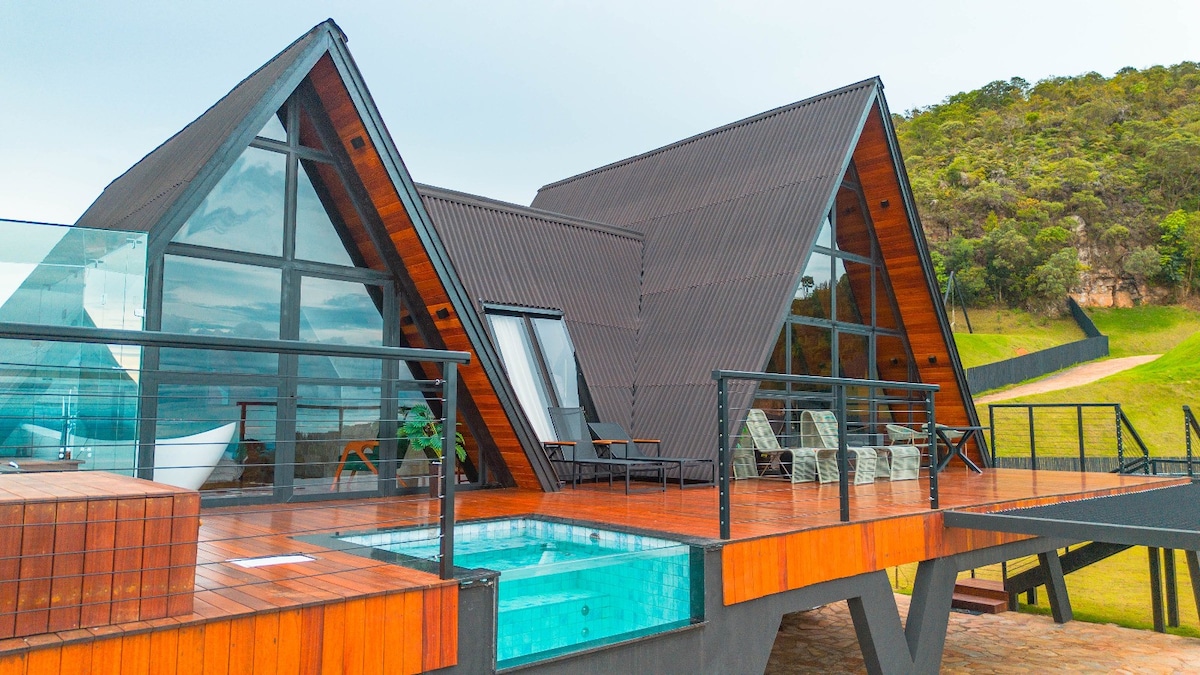 Matatagpuan sa Moeda/MG, 45 km mula sa Belo Horizonte, ma - access ang lahat ng aspalto. Idinisenyo sa Glass, ang arkitektura nito ay sumasama sa panlabas na kapaligiran, ay may Amazing Vista da Serra da Moeda. Idinisenyo ito nang may pagiging sopistikado at kalidad para makapagbigay ng kaginhawaan at privacy. Ang aming estruktura ay may kumpletong kusina, hot tub, queen bed, TV, internet, gas double bath, air conditioning, suspendido na pahalang na network, natural na stone pool.