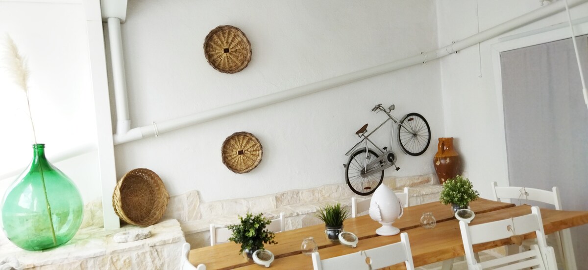 Matatagpuan sa isa sa pinakamagagandang kanayunan ng Monopoli, 10 minuto ang layo ng aming bahay sa pamamagitan ng kotse mula sa sentro ng lungsod at sa mga beach. Perpekto ang aming tuluyan para sa mga pamilya. Ang aming tuluyan ay may pangunahing pasukan na may mesa para sa tanghalian o hapunan, master bedroom na may banyo at air conditioning at pangalawang kuwarto na may air conditioning Sa labas, magkakaroon ang aming mga bisita ng komportableng gazebo na may mesa para masiyahan sa kagandahan ng nakapaligid na kalikasan. Libreng paradahan! Bigyang - pansin NA WALA KAMING KUSINA