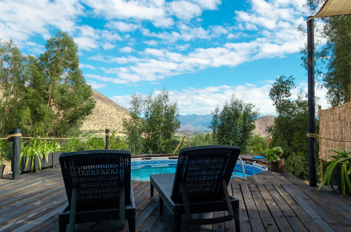 Casa minimalista 150 M2 de dos pisos, arquitectura única, esta al medio de un bosque nativo, vista totalmente despejada sobre el valle, amplia Tinaja, living comedor con cocina abierta, hall de acceso de triple altura, dos amplios dormitorios principales, camas super King, calefacción C/Estufa a pellet, terrazas en dos niveles, parrilla, Internet Starlink, para subir es necesario 4x4, si no tienen su auto queda guardado abajo y nosotros los subimos *Tinaja se cobra aparte. *Tenemos masajes !