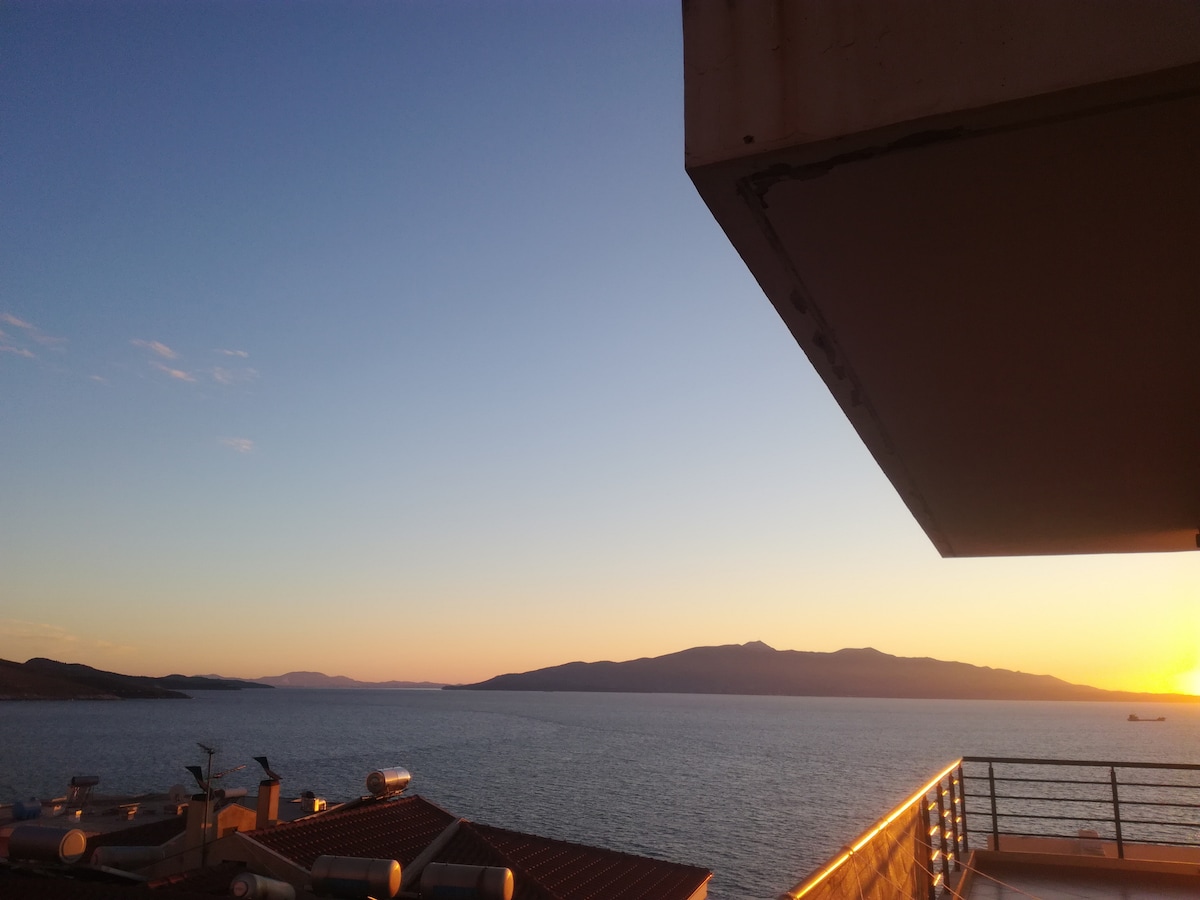 Magrelaks at magpahinga sa tahimik at naka - istilong tuluyan na ito sa aming moderno, bagong inayos at kumpletong apartment na may kaakit - akit at magandang tanawin ng turquoise - blue Ionian Sea at isla ng Corfu sa Greece. Mula sa maluwag at malaking balkonahe, mag - enjoy ng mabangong kape sa umaga, na ihahanda mo salamat sa mga filter ng tubig na naka - install para sa higit na kaginhawaan at kaginhawaan, at sa loob ng 15 minuto, maglakad - lakad sa promenade, pampublikong beach at Saranda Center