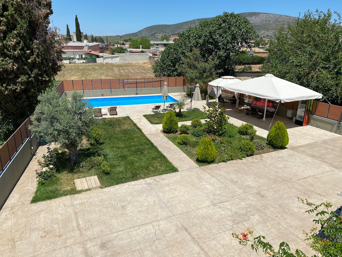Villa Axiothea (ang pangalan ay kinuha mula sa unang babaeng mag - aaral ng sinaunang % {bolder Plato at nanirahan sa Nemea sa panahon ng ika -5 siglo B.) Ang villa ay 120 sq .m at matatagpuan sa kanayunan at sa isang tahimik na kapitbahayan. Nagtatampok ito ng neoclassical na muwebles, 3 maluwang at malinis na silid - tulugan, isang bagong kusinang may kumpletong kagamitan, isang banyo at isang kuwarto sa gym! Malaking hardin na may damuhan, mga swing ng mga bata, lugar para sa piknik, paglalakad at pagbabasa.
